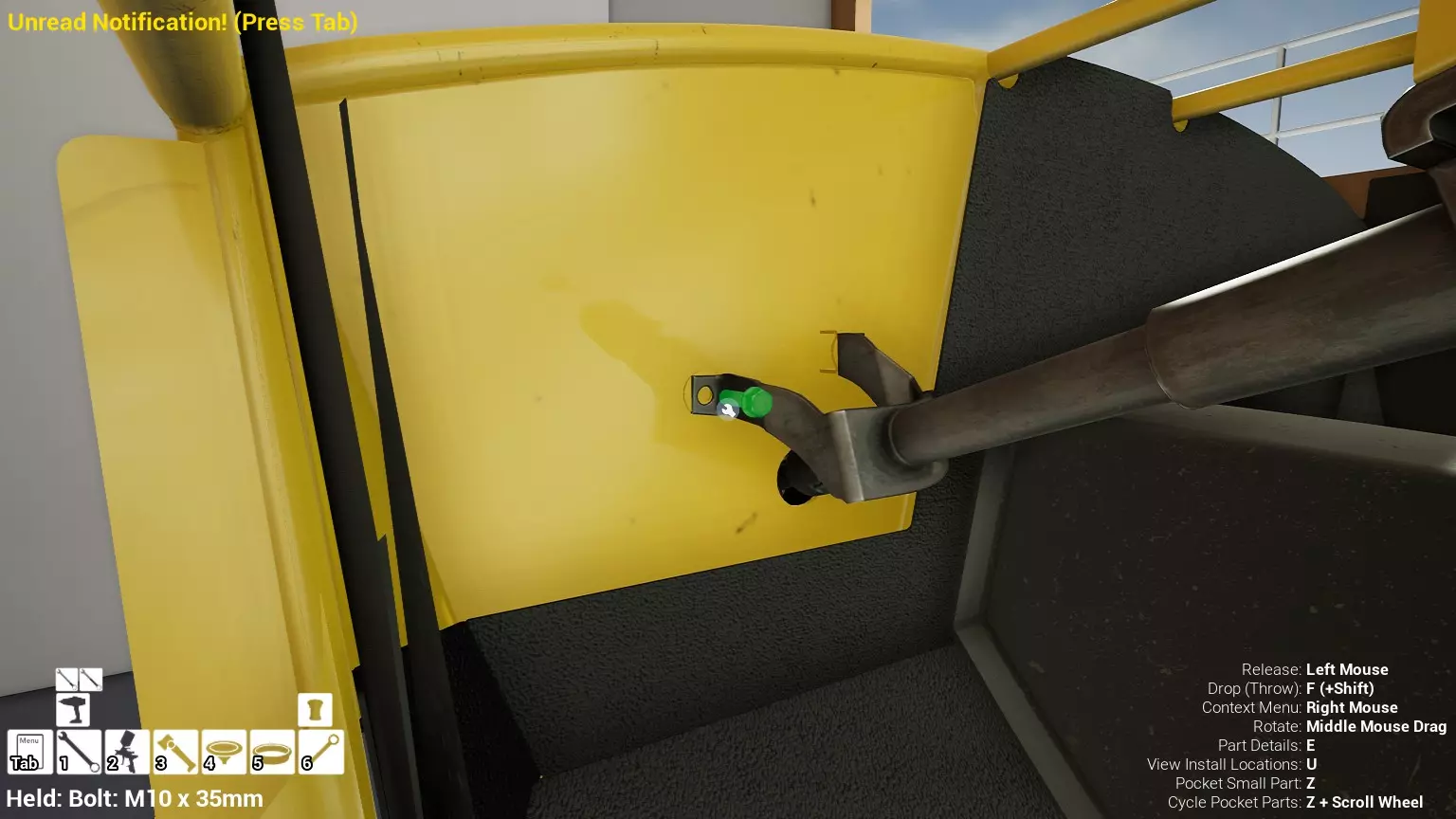 将这四个部件分别安装在每个角落,确保它们的分布能帮助发动机保持良好的平衡,防止其倾斜。然后抓住模块(在桌面模式下左键点击模块)并轻微移动,使其与底盘“分离”。现在回到起重机的控制面板,将发动机从底盘上完全吊起。