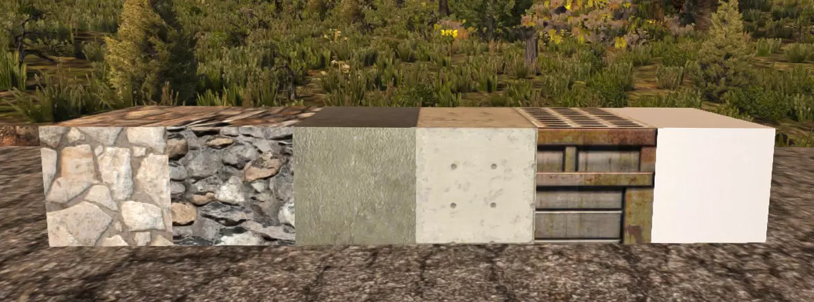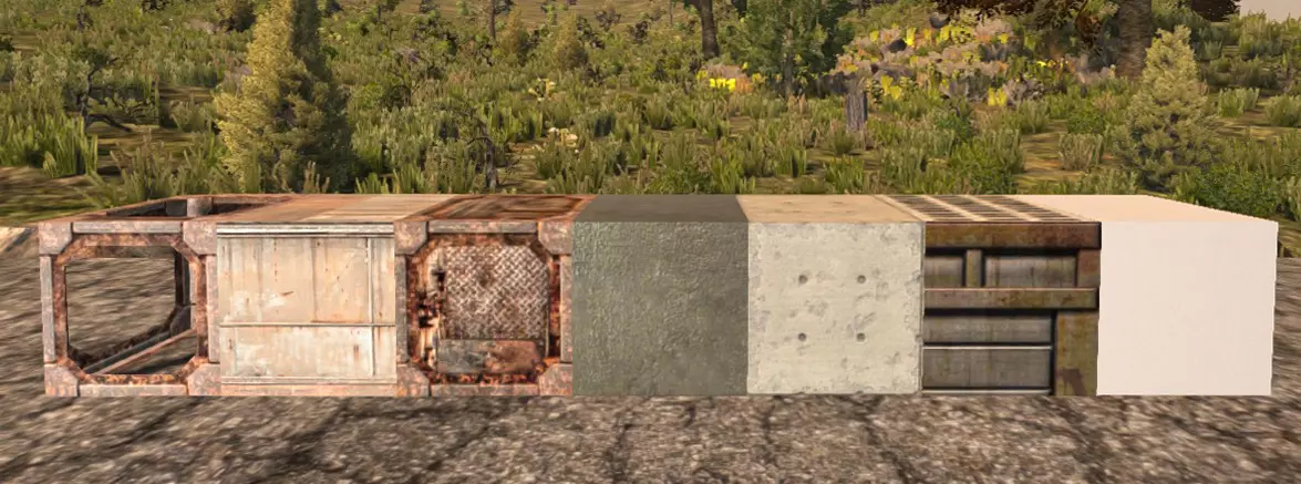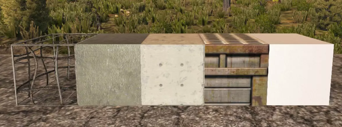 废弃框架 300生命值 可在背包、工作台和熔炉中制作 废弃铁墙 1000生命值 总计1300生命值 强化废弃铁墙 1000生命值 总计2300生命值 湿混凝土块 1500生命值 可在背包或工作台中制作 混凝土 3000生命值
