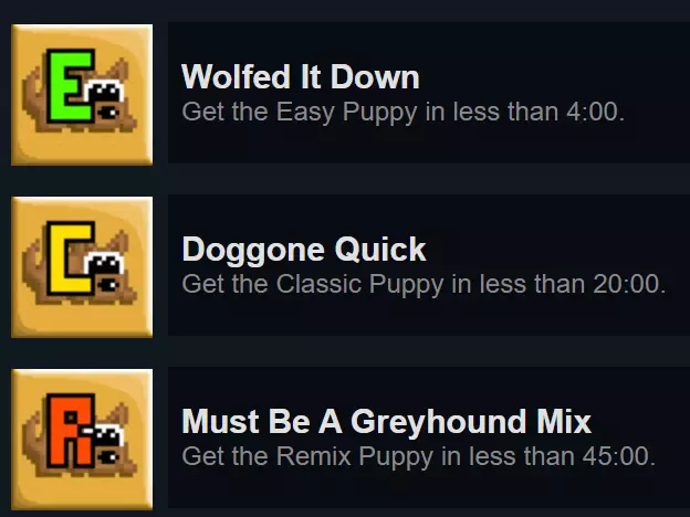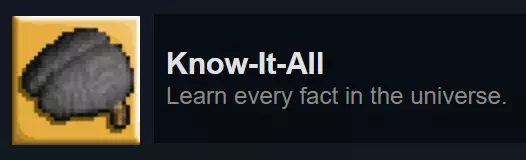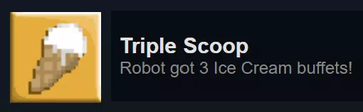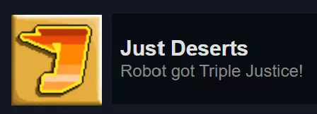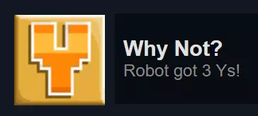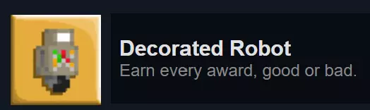 完全完成《Robot Wants It All》的“Robot Wants Data”图鉴。图鉴解锁后才开始计算进度,解锁图鉴需先购买“Robot Wants Y History”。图鉴条目如下: 全部: 机器人(所有地图,完成拼写挑战) 猫咪篇: 水滴怪(橙色,所有地图) 墨普怪(红色,所有地图) 史莱姆之王斯拉格( Boss,经典模式和重混模式) 鱿鱼怪(蓝色,所有地图) 扎普怪(绿色,仅重混模式) 小狗篇: 方块怪( Boss,经典模式和重混模式) 构造舱(重生机器,所有地图) 直升机机器人(重生敌人,所有地图) 希普伦(紫色,所有地图) 悬浮 zorg( Boss,所有地图) 心灵螳螂(青色,仅重混模式) 斯纳克(绿色,所有地图) 石刺怪(屋顶附着怪,经典模式和重混模式)(Blocko的Boss房间中重生的钟乳石不计入) Fishy: Bad Robot(垂直悬浮,所有地图) Battle Bat(Boss,经典模式和重混模式) Batto(绿色蝙蝠,所有地图) Das Boxen(Boss,所有地图) Drillbaby(Boss,经典模式和重混模式) Dungeon S. Crab(Boss,所有地图) Jelloid(水母,所有地图。在《Fishy Wants Robot》中极为常见(如果你需要刷怪的话) 克罗布(螃蟹,所有地图) PAL-1000( boss,经典模式和重混模式) 迟钝钓鱼者( boss,所有地图) 犀牛甲虫(冲锋者,简单模式和重混模式) 斯纳普尔(蜗牛,所有地图) 炮塔(固定炮塔,所有地图) 冰淇淋:愤怒盒子( boss,经典模式和重混模式) 坏机器人(从《Fishy》复用,所有地图) 镜像机器人(绿色坏机器人,需要疯狂变异器才能在愤怒盒子战斗外生成) Char-L07( boss,经典模式和重混模式) 直升机机器人(从《Puppy》复用,所有地图) 赛博克罗布(绿色,所有地图) 毁灭者( boss,经典模式和重混模式) 邪恶机器人(骷髅,所有地图) 葡萄机器人(炸弹,所有地图) 赫夫特(移动方块,经典模式和重混模式) 神圣鼹鼠( boss,所有地图) 迷你UFO(UFO,所有地图) 纳米蜂群( boss,经典模式和重混模式) 安全机器人( boss,所有地图) 安全核心阿尔法(Boss,经典模式和重混模式) 安全核心贝塔(Boss,经典模式和重混模式) 太空狂人(Boss,所有地图) 汤姆·斯通(Boss,经典模式和重混模式) 超级盒子(Boss,经典模式和重混模式) Y:屏障(激光墙,所有地图。使用EMP禁用后可收集数据) 践踏者(碾压机,所有地图。使用EMP禁用) 史莱格(鼻涕虫。理论上所有地图都有,但经典地图中只有一只,所以实际上存在于简单模式和重混模式) 布莱斯特龙(Boss,仅重混模式) 正义(注意:掉入熔岩的敌人若掉落数据,会自动收集数据): 四佩(Boss,经典模式和重混模式) 五十佩(Boss,所有地图) 熔岩企鹅(企鹅,所有地图) 克隆体(五十佩生成,所有地图) 死亡机器人(加农炮,仅重混模式) 杜普oid(可收集物)当小狗前来收集数据时,与它们待在一起 特隆克皇帝(首领,经典模式和重混模式) 无法理解的恐惧(首领?仅经典模式) 冰面特工(持枪蓝衣敌人,所有地图) 冰面密探(潜行蓝衣敌人,经典模式和重混模式) 岩浆反应堆(屏障生成器,所有地图) 声波地雷(追踪炸弹,所有地图。若成功击中机器人则不会掉落数据) 星佩(首领,经典模式和重混模式) 托佩(首领,经典模式和重混模式)
