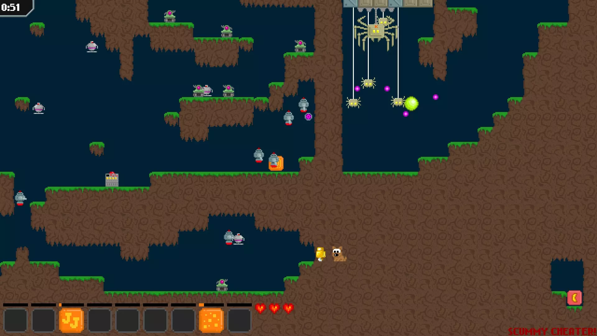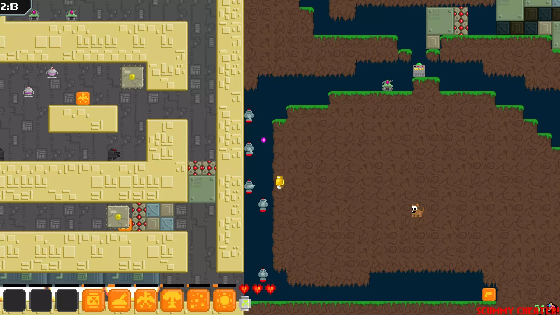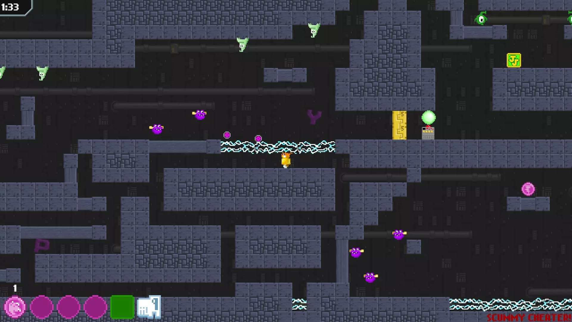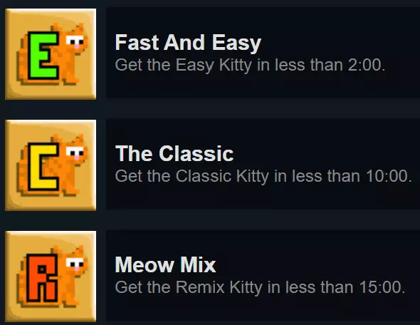 不拾取枪械通关猫咪地图。正如图标所示,不使用作弊手段的话,需要在经典模式中使用坦克机器人硬扛那些本应击杀以清理路径的敌人。在简单难度地图中,若不使用作弊手段则无法完成,因为在跳跃前就会获得枪械。我尚未测试在重混地图中不使用作弊手段是否可行,毕竟何必给自己找这种麻烦呢?