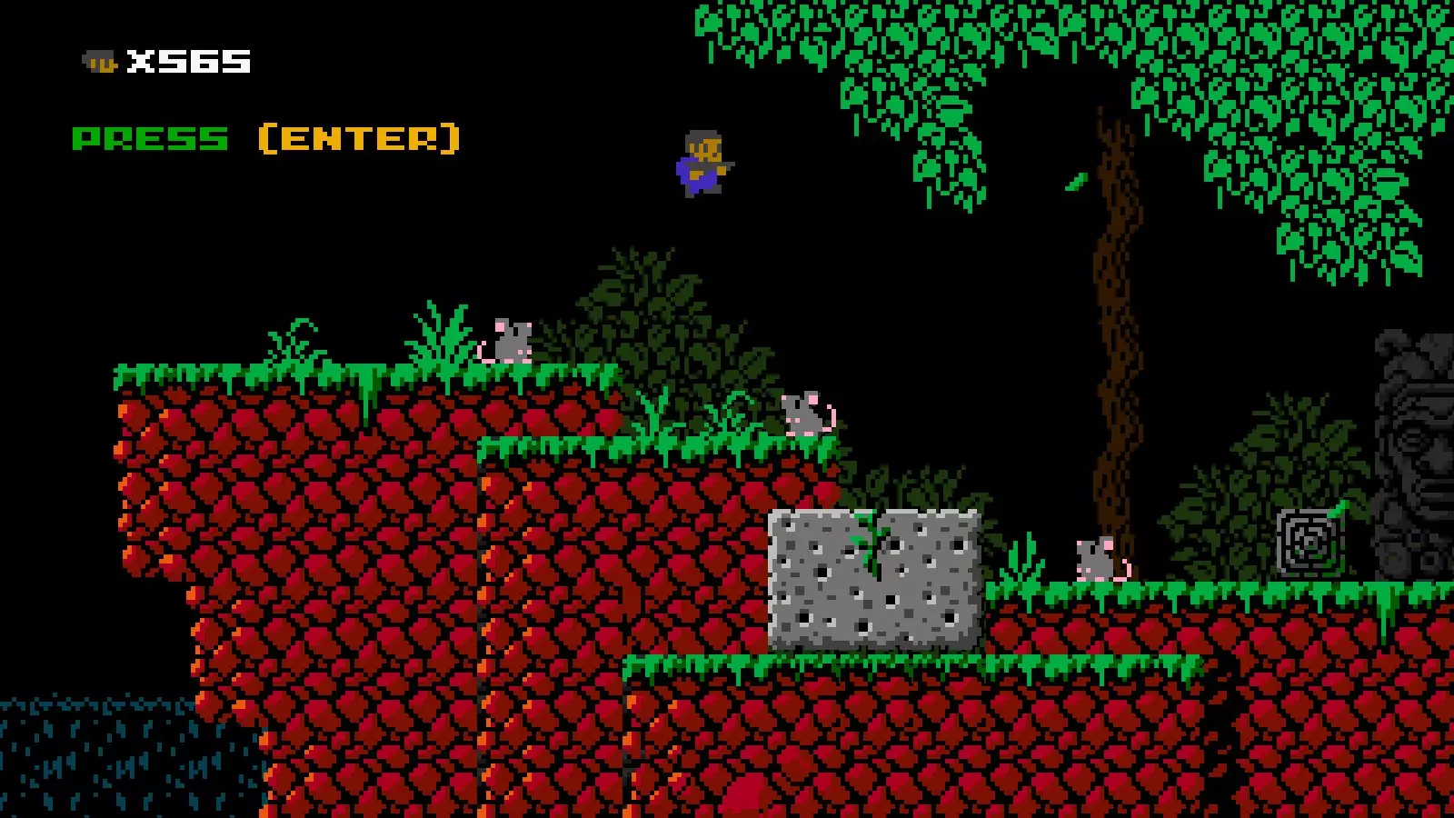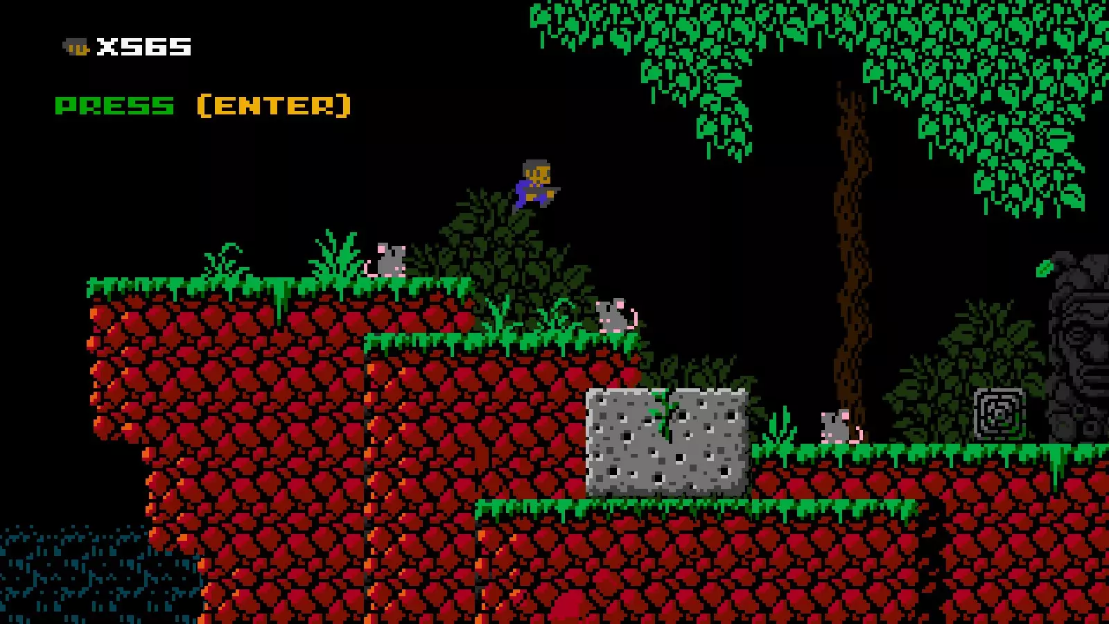 他还拥有无限墙壁跳跃能力。每次墙壁跳跃会让他向上移动一格并向外移动约两格,之后他会沿着平缓的弧线继续向外移动,除非玩家控制他前往其他方向。短跳墙壁跳跃和高跳墙壁跳跃之间没有区别,只是忍者阿班无法从高跳墙壁跳跃中进行空中跳跃。试着快速念五遍这句话!