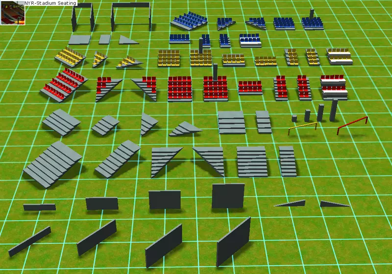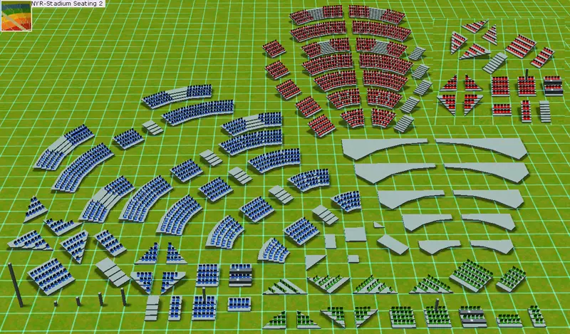 NYR 体育场座位组合1和2 需要建造体育场座位吗?这里包含三种座位类型:平坦型、缓坡型和陡坡型,以及各种弯道、斜道和其他组件。第一个组合包包含竞技场入口组件和墙体,因此是必要的。第二个组合包可视为第一个组合包的扩展补充。
