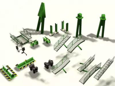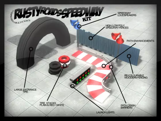压缩空气的锈迹赛道套件 该套件包含适用于打造赛车主题设施和过山车的场景元素,内含栏杆、围栏、轮胎、扬声器、减速带及其他配件。