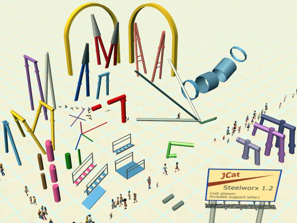 Jcats Steelworx 这个资源包可以说是让我开始接触这款游戏自定义内容的契机。如果你不打算获取其他任何游戏内容,【一定要获取这个】。该资源包包含了游戏中大多数(如果不是全部)过山车的支架,但不包括木质过山车。里面有各种不同的支架、延伸部件和钢管,可用于建造你的过山车。还包含了【支架消除器】,它能方便地移除那些难看的默认支架。对于想要重建“顶级刺激赛车”的玩家,这个资源包包含了你需要的 strata 支架。作为早期推出的大型支架资源包之一,每个人都应该拥有它。尽管市面上已有更详尽且外观更酷的支持包,但这个支持包凭借其悠久的存在时间,仍是新手的绝佳选择。