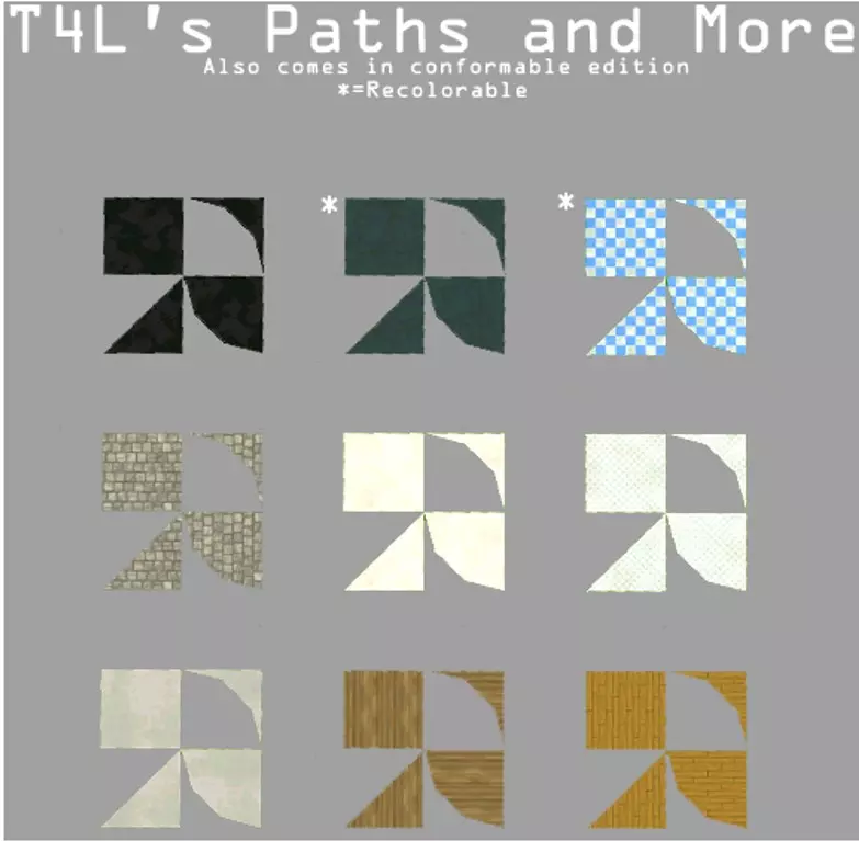 T4L-路径及更多 与【围栏及更多】附加组件类似,这些是可供使用的路径覆盖物。尽管它们没有斜坡和楼梯的变体,但包含了多种路径覆盖物。