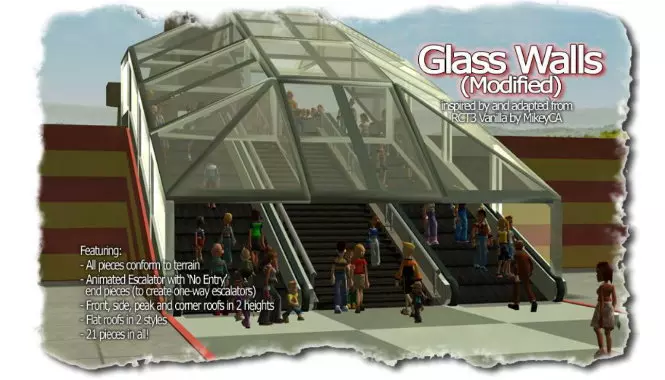 玻璃墙(修改版) 你觉得游戏里的玻璃墙已经很棒了?那可不一定。玻璃墙修改版基本和原版一样,但增加了可贴合地形的墙体、更多屋顶部件以及自动扶梯。
