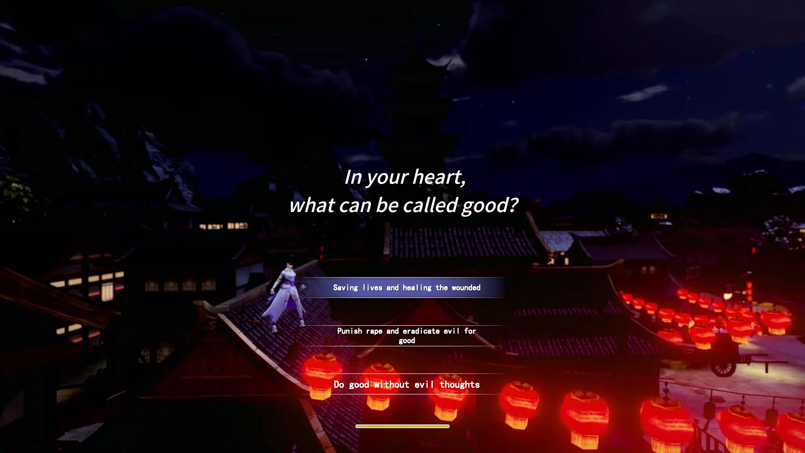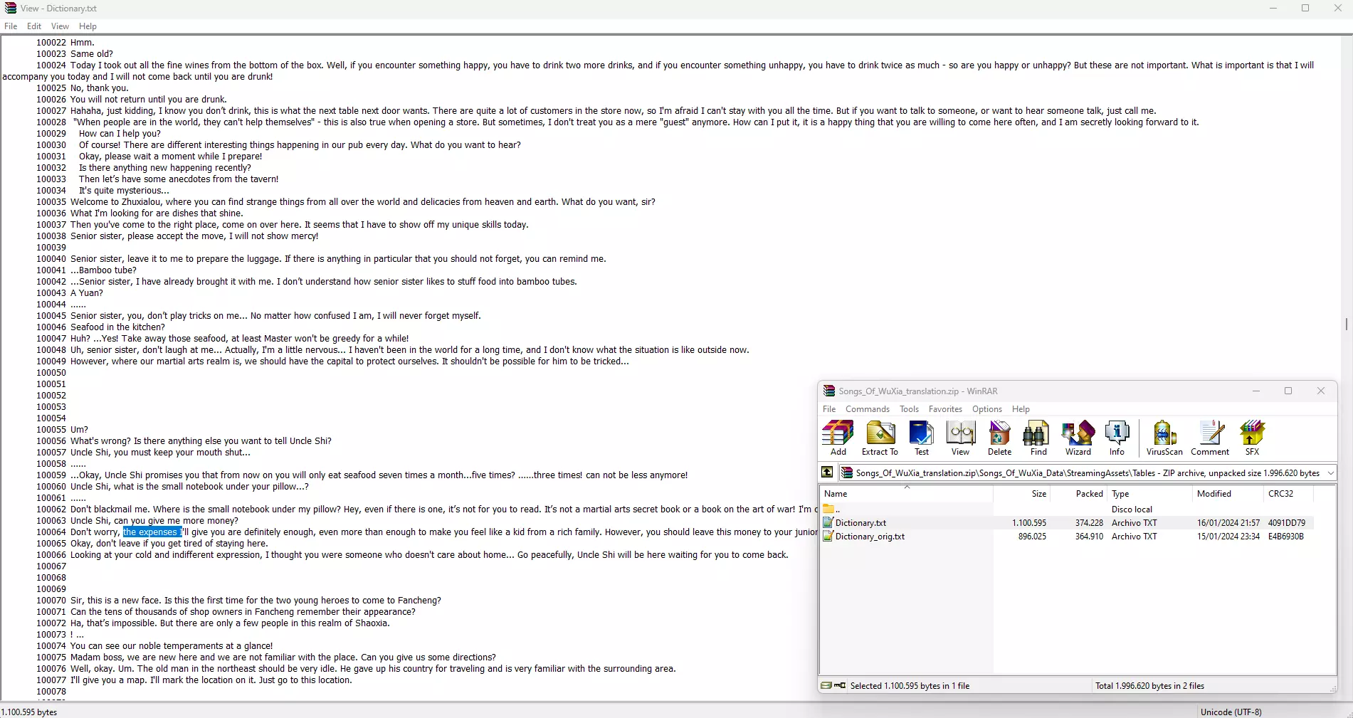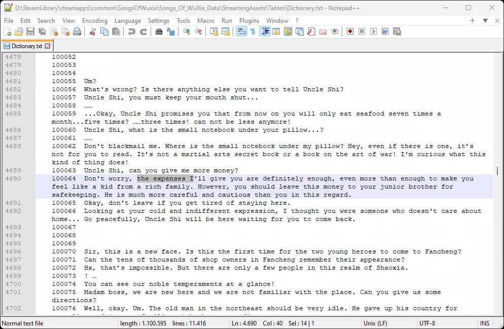 如何进行游戏翻译及翻译下载。由Csf91制作,并已获得开发者许可。版本1.1 简介 与开发者沟通后,我便利用空闲时间进行游戏翻译。我选择在此分享,是因为这里是最佳平台。由于pastebin存在大小限制无法使用,因此我会提供Mega下载链接。 该翻译为半自动化处理,但我已尽力确保物品和角色名称在各文本/翻译中保持一致。所谓半自动化,即先通过机器翻译,然后由我手动校订和编辑(对于不满意的部分会进行彻底重译)。 由于我尚未通关游戏,部分内容未能测试。它们应该能正常运行,但文本可能过长,且由于其运行机制,我无法将文本换行显示。 最后,如果你发现漏洞,请在此处发布,这样在解决问题时更容易追踪并联系你。 由于这是我首次制作此类内容,希望你能给予支持。 免责声明 我已获得开发者的许可进行翻译工作。 部分文本可能因翻译后篇幅增加至原长度的三倍而无法完美适配,但对于对话内容,若出现此情况,你仍可通过按下鼠标中键在日志中查看完整内容。我没有进行任何逆向工程或修改任何打包的游戏文件。这意味着我无法翻译例如设置选项/标签或战斗选择图标等内容。我已将所有能够翻译的内容100%完成翻译。 开发者请注意:如果您正在阅读本文,请确认许可证,这可能在Steam将来尝试将其下架时有所帮助。 下载与安装方法 链接已更新 - 2024年1月17日 从Nexusmods下载文件 导航至游戏安装文件夹并解压(压缩包内包含所需的文件夹结构)。 或者打开压缩包并解压“Dictionary”。将“txt”文件放入【侠道游歌】的【SongsOfWuxia Songs_Of_WuXia_Data StreamingAssets Tables】目录中(覆盖原文件,或重命名原文件)。 可以忽略“Dictionary_orig.txt”,该文件是原始文件的备份。 如果启动游戏后,标题界面显示“按任意键继续”,则说明操作完成,可以开始游戏,可参考下方第一张截图示例。 ZIP文件中包含名为“Dictionary_orig.txt”的原始“Dictionary.txt”备份文件,与翻译文件一同提供,以便在需要将游戏恢复为原始状态时使用,无需验证文件或重新安装游戏。 截图