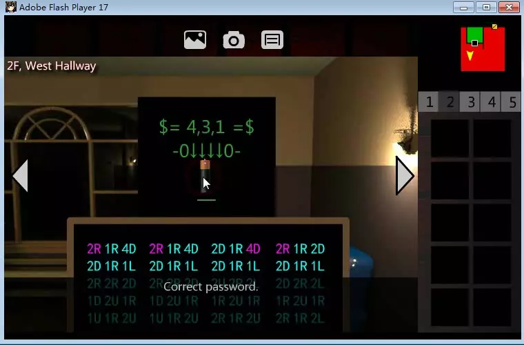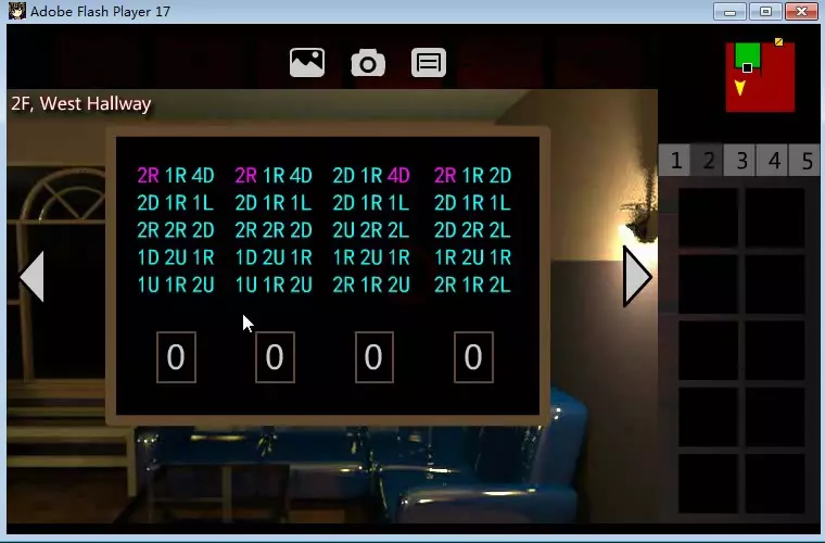 这是什么意思? 我们将每组字符分为一个数字和一个字母。 我相信你一定知道U代表上,D代表下,L代表左,R代表右。 (实际上你可以从【5楼西走廊】获得提示,那里有一块板子给出了这个谜题的线索。) 而数字则表示你移动的步数。 可能有点难理解。不过没关系,看看下面的例子: