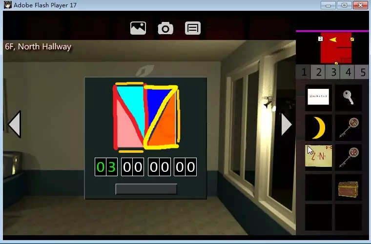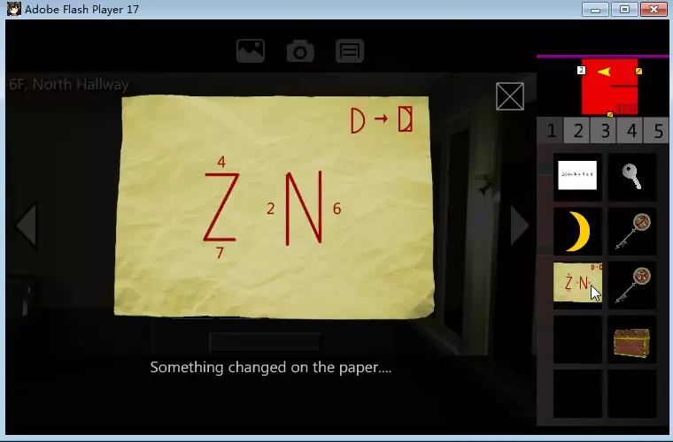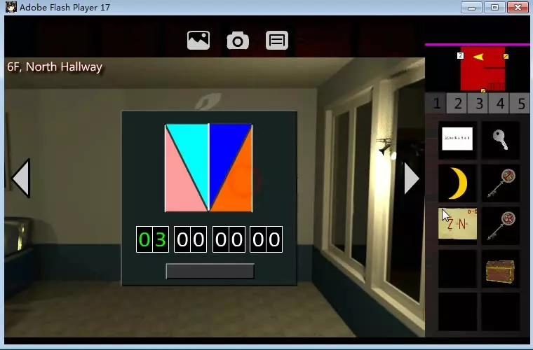 我们将新笔记定义为【ZN笔记】。 现在前往经理室: 【5F,经理室】 在书桌右侧,有一个闪闪发光的物品。拿起【青色 puzzle piece】。 【6F,北走廊】 好的。这里是【ZN Puzzle】,它是觉醒结局路线中最难的谜题之一。该谜题位于门上有灰色“2”字样的门的右侧。 首先,拿出你在游戏室里的4x4谜题照片。垂直观看。