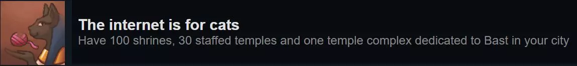 中型地图很适合达成此成就,因为巴斯是你的守护神。伊杰特维是战役后期另一个可用的地图。 成本明细: 100座神龛 × 100金币 = 10,000金币 30座神庙 × 150金币 = 4,500金币 1座神庙建筑群 = 2,000金币 总成本:建造所有所需建筑需16,500金币 所需员工总数:290人 住房升级要求以下是房屋升级所需满足的额外条件(吸引力始终为必要条件): 简陋茅舍:水(水井或供水系统) 坚固茅舍:1种食物类型 简陋棚屋:1位神明 普通棚屋:水(必须来自供水系统) 粗糙小屋:1种娱乐形式 普通小屋:陶器 中等家园:医师或停尸房 + 第2种娱乐形式 宽敞家园:啤酒 中等公寓:法院(需2×2格空间) 宽敞公寓:学校或图书馆 普通住宅:牙医 + 第2种食物类型 宽敞住宅:亚麻 雅致住宅:2位神明 精美住宅:第3种娱乐形式 + 1种奢侈品(如珠宝)(需3×3格空间) 普通庄园:停尸房 宽敞庄园:图书馆 + 3位神明 雅致庄园仅需宜居度?宏伟庄园 第四种娱乐形式+第二种奢侈品(如乌木) ----需要4x4方格----普通宅邸 三种食物 宫殿式宅邸(最高级) 住宅升级要求 以下是房屋升级所需条件,只要满足下一类型的额外要求(宜居度始终是必要条件)
