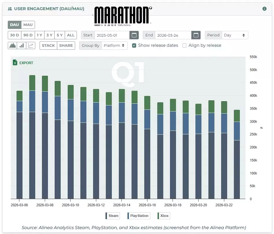 Bungie这款新的硬核射击游戏在首发阶段似乎难以触达更广泛的受众,但值得注意的是,已购买游戏的玩家留存度很高。虽然Steam同时在线玩家数仅反映了玩家基数的一部分,但报告显示,跨全平台,《失落星船:马拉松》的日活跃用户平均在30万至48万之间。