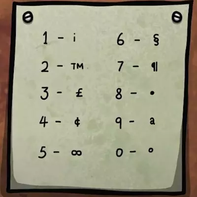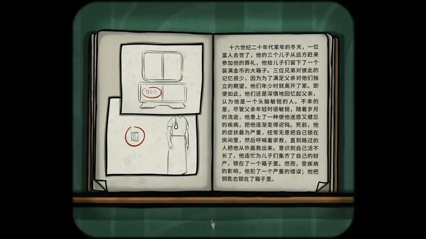 纸条底部有关键词,需要借助刚刚打开的箱子进行翻译。第二部分提示在人体模型上方的书里,打开它,通过对照字母,将信件末尾转换成可理解的文本。似乎纸条上的词语是有变化的,所以如果你的版本与截图中的信件不同,就需要自己多花些功夫了。不过,这个谜题本身并不是很难,而且还是游戏中最好的谜题之一,嗯,嘿,哈哈。 截图上的单词是MUSIC、KEY、TREE。 翻译密码并输入到左上角的盒子里。盒子会打开,让你进入一个有墙纸的房间……某种黄棕色的……?好吧。我会叫你【黄铜房间】。