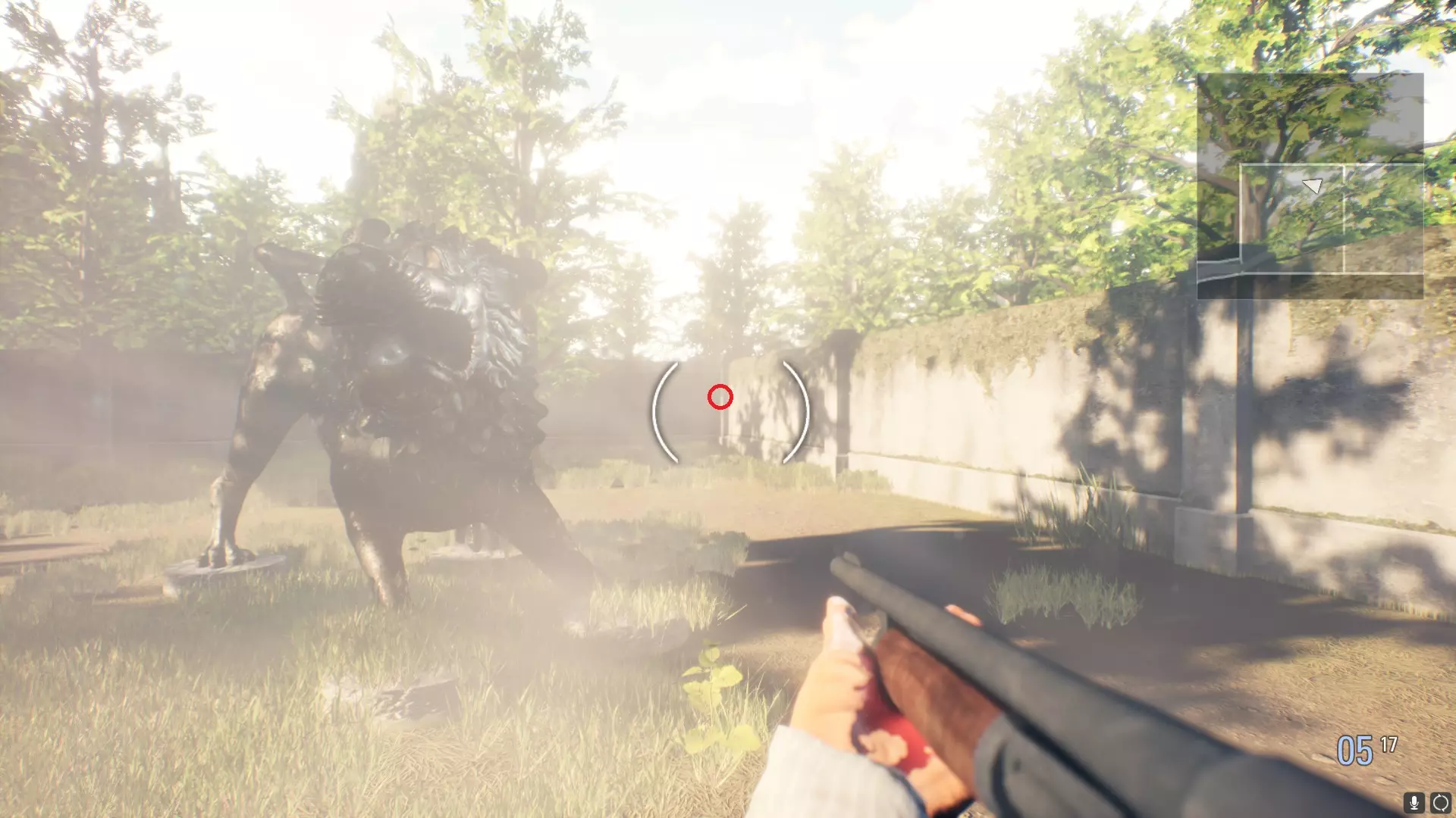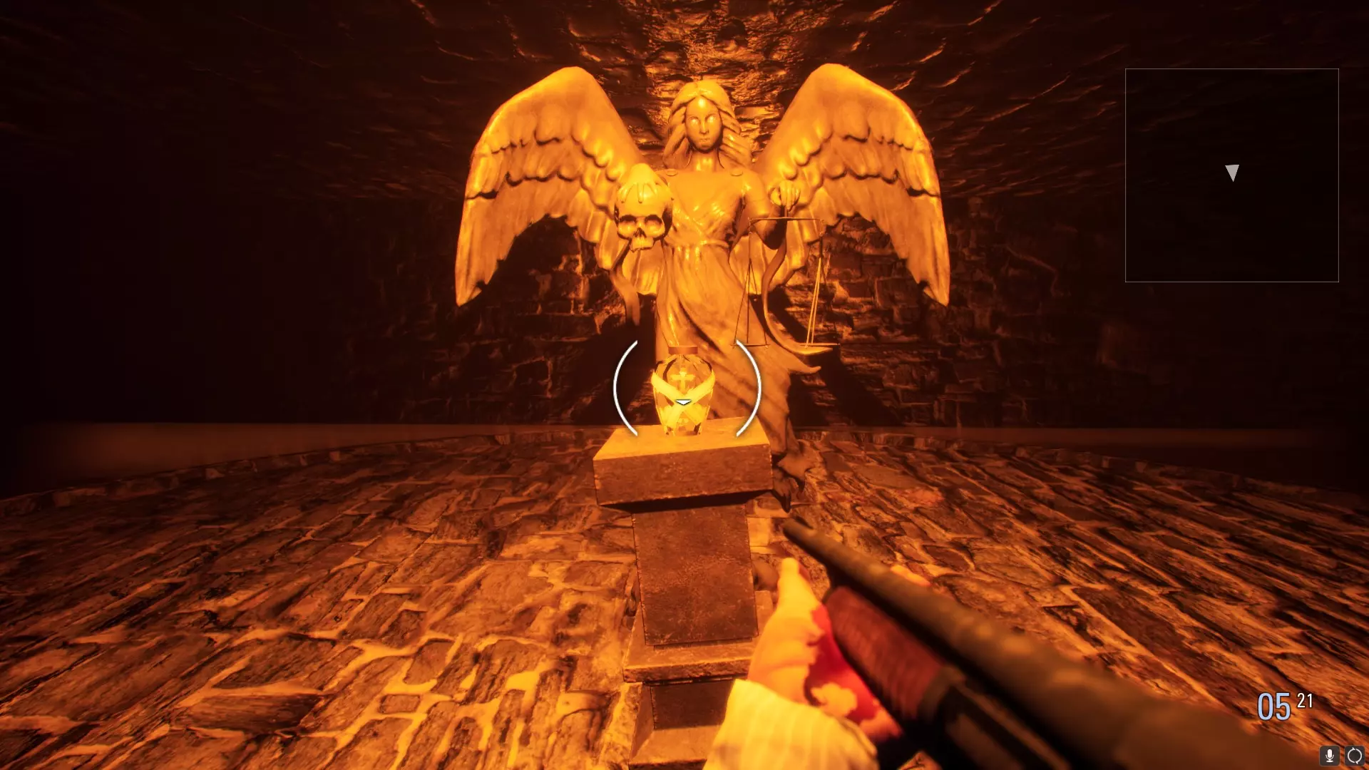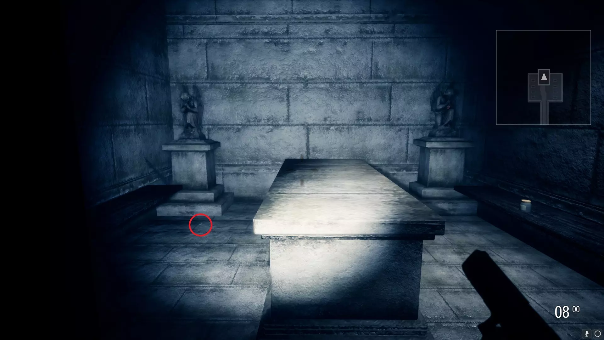 第四章 首次进入加西亚宅邸的阁楼后,你会来到炼金术士之家下方的地下墓穴。这里有三扇门,门上都挂着生锈的挂锁(可以用在地下墓穴内找到的某种水银混合物将其移除)。其中一扇门后还有一扇挂着金色挂锁的门。与这扇门互动时会显示“我必须去一个安全的地方”。 合成王水并将其用于入口门上的金色挂锁后,你可以取回武器并通过梯子离开。【不要通过梯子离开,离开后将无法返回地下墓穴】。拿到枪后,返回前面提到的那扇门,用王水打开挂锁。门内有一件圣物,由巨型穆恩库勒斯看守。击败巨型蒙格鲁斯并获取圣物(如果你不想进入实际房间,可以利用卡墙角的方式在走廊里射击这只野兽来轻松过关)。