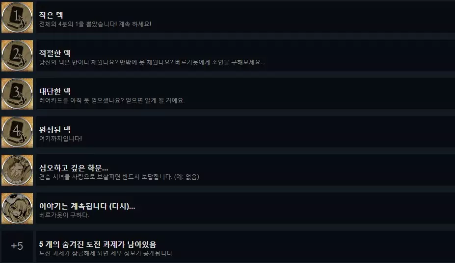 未获得的成就参考英文攻略进行了推测,并不确定。 27. 从初始卡组到完整卡组 从上述第一个抽卡成就开始的战役成就。 通过游戏获得的传承点购买剧情卡牌即可解锁。 推测“深邃且…故事仍在继续”也是在购买卡牌过程中出现(参考英文攻略)。 28. 其他成就 隐藏成就5个中,有2个通过完成27号成就可能解锁,其余3个(未获得,韩文名称未知): -1. 观看卡牌119【帝国王冠】的短剧,将解锁成就【To be Continued...?】 -2. 获取卡牌43【公爵】后,将解锁成就【Save The Best For Last?】 28-1. 【The Best Duke.】获得第43号卡牌【公爵】后,若你最后抽到公爵并结束游戏,也将获得一项成就。 28-2. “他们甚至没锁门也没关窗!” 使用【贿赂】从其他玩家处窃取【帝国皇冠】,将解锁一项成就。 28-3. “下次记得锁门关窗” 被其他玩家用【贿赂】偷走【帝国皇冠】,将解锁一项成就。 除非特意进行一对一较量,否则这似乎非常困难,即使用AI也颇具挑战。这两个成就几乎肯定需要与其他玩家一起游玩才能解锁。我只见过一次CPU购买帝国皇冠。我推荐使用包含炼金术士、工业都市、贸易船和女忍者的补给,再加上贿赂,这样能轻松赚钱和获得贿赂。攻略者虽然这么写了,但具体解读还是因人而异。