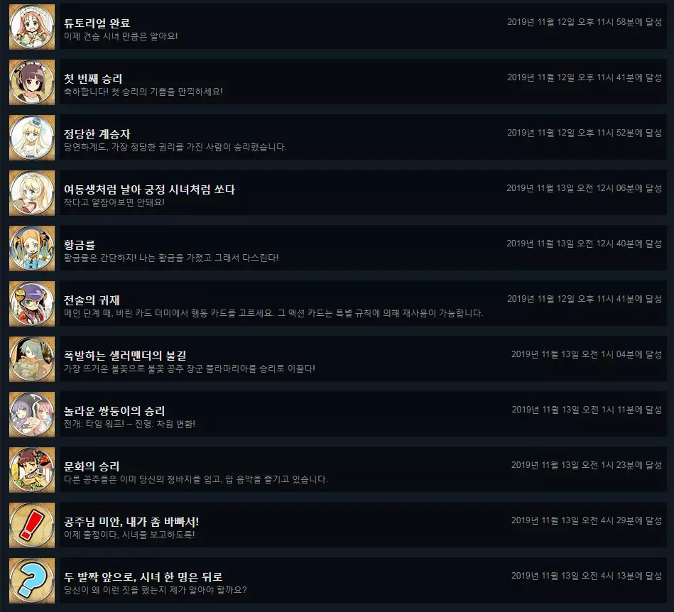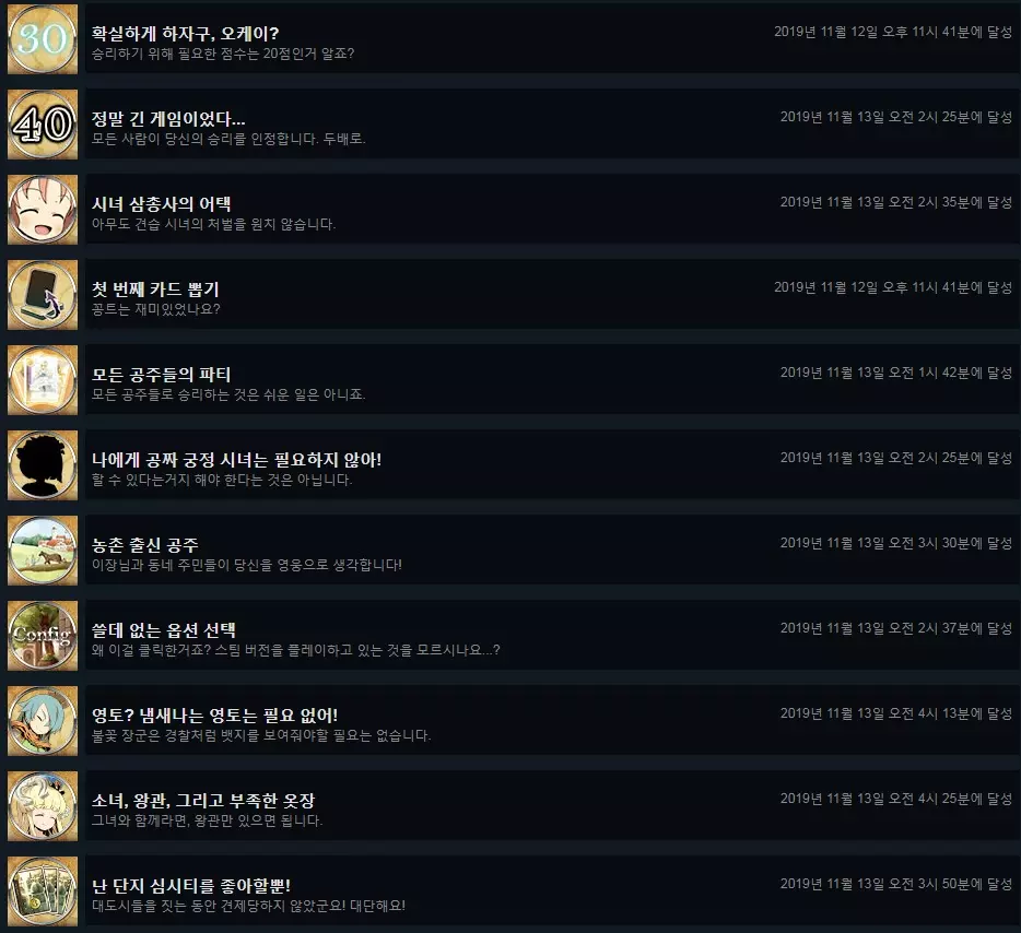 6. 稳操胜券,对吧? 以30点以上继承点数获胜时获得。 7. 真是一场漫长的游戏…… 以40点以上继承点数获胜时获得。 需要动用王冠和帝国首都等全部资源。 8. 侍女三剑客的攻击 将3张见习侍女全部作为继承点数使用(-6点)并赢得游戏。 由于需要故意给公主增加负担,同样建议单人游玩。 9. 第一次抽卡 在下方未完成列表中再次提及。 10. 所有公主的派对 使用所有公主各获胜1次。 11. 我不需要免费的宫廷侍女! 拥立拉奥莉莉时,立即右键点击选择0张宫廷侍女,即不接受侍女时获得。 12.13. 农村出身的公主 拥立公主时,若直辖地全部使用农村,即可获得。 由于要求6张1元卡牌,条件比想象中更苛刻,建议积极使用抽卡或获得金币的卡牌,例如炼金术士、贸易船等。 14. 没用的选项选择 在主大厅的设置中,取消勾选自动检查更新,即可获得。 15. 领土?不需要有味道的领土! 拥立芙拉玛利亚时,农村不会迁移为直辖地,利用这一点将直辖地全部设为农地,使直辖地数量为0,即可获得。与农村出身的公主类似。 16. 少女、王冠以及不足的衣橱 仅依靠露露娜希卡的6点即时继承点和王冠的14点达成胜利,即可获得。我只是喜欢模拟城市! 拥立公主时,将直辖地发展为大都市3级即可获得。