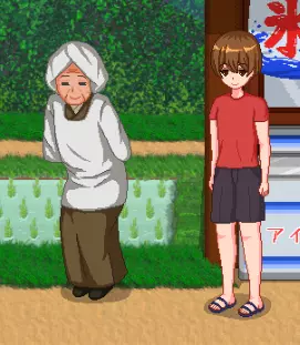 他需要3条香鱼,你把鱼交给他后,他会给你一根绳子,这是建造【秘密基地】所需的物品之一。秘密基地位于河对岸,建成后能解锁蕾娜。之后,如果你再给他3条香鱼,他就只会给你150日元了。(坐在板条箱上的老人——老农夫)