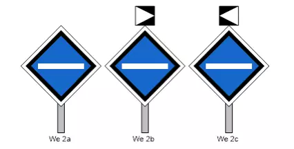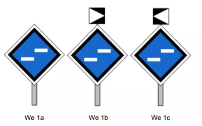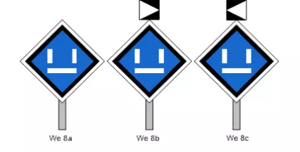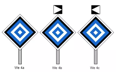 We 4a、We 4b、We 4c 指示器用于标示电力牵引车辆禁止通行的地点,特别是诸如接触网损坏、接触网附近作业、接触网终点等情况。 We 8a、We 8b、We 8c【无电运行指示器】用于标示电力牵引车辆应不从接触网获取牵引电流通过的地点,对于交流电情况,还需关闭主开关。
