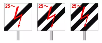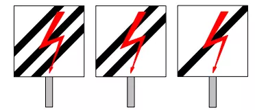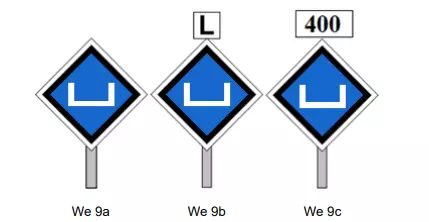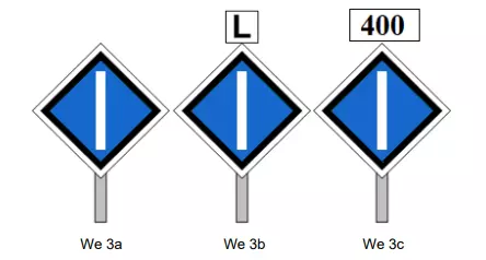 - 告知司机已驶离3千伏直流电供电区域 - 标志We 10a、We 10b、We 10c、We 10d、We 10e和We 10f仅用于标示两种不同牵引供电系统的分隔区域,不得用于电气化区域与非电气化区域的边界 - 标志We 10a、We 10c或We 10e设置在系统分隔区段内,即25千伏交流电、15千伏交流电或3千伏直流电相应供电区域的起始位置 - 标志W ETCS 1【ERTMS/ETCS 1级LS区域进入预告】