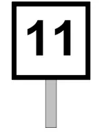 -标号W9、W14设置在限速区段的终点,带有黑色字母C,表示限速适用于列车头部。 -若警告包含在固定警告清单中,标号W9应与第7点中规定的标号W8一起使用。 -标号W9应设置在标号W8之后(从行驶方向看),位于需要减速行驶的区段的起点和终点。 标号W11a、W11b和W11c【预告标号】 预告标号根据其设置位置,表示标号之后存在: -进站或区间信号机的预告牌,或其信号显示可能无法看到的信号机。连续模式,带要求距离(W 11a指示器)