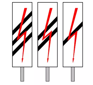 We 1a、We 1b或We 1c信号机设置在正线和车站的主要轨道上,位于相应的We 2a、We 2b、We 2c信号机之前,其距离至少为: a) 400米——适用于速度不超过60公里/小时(含60公里/小时)的线路区段, b) 600米——适用于速度超过60公里/小时至100公里/小时(含100公里/小时)的线路区段, c) 800米——适用于速度超过100公里/小时的线路区段; We 2a、We 2b、We 2c【受电弓降下信号机】表示列车从此处开始需降下受电弓运行。