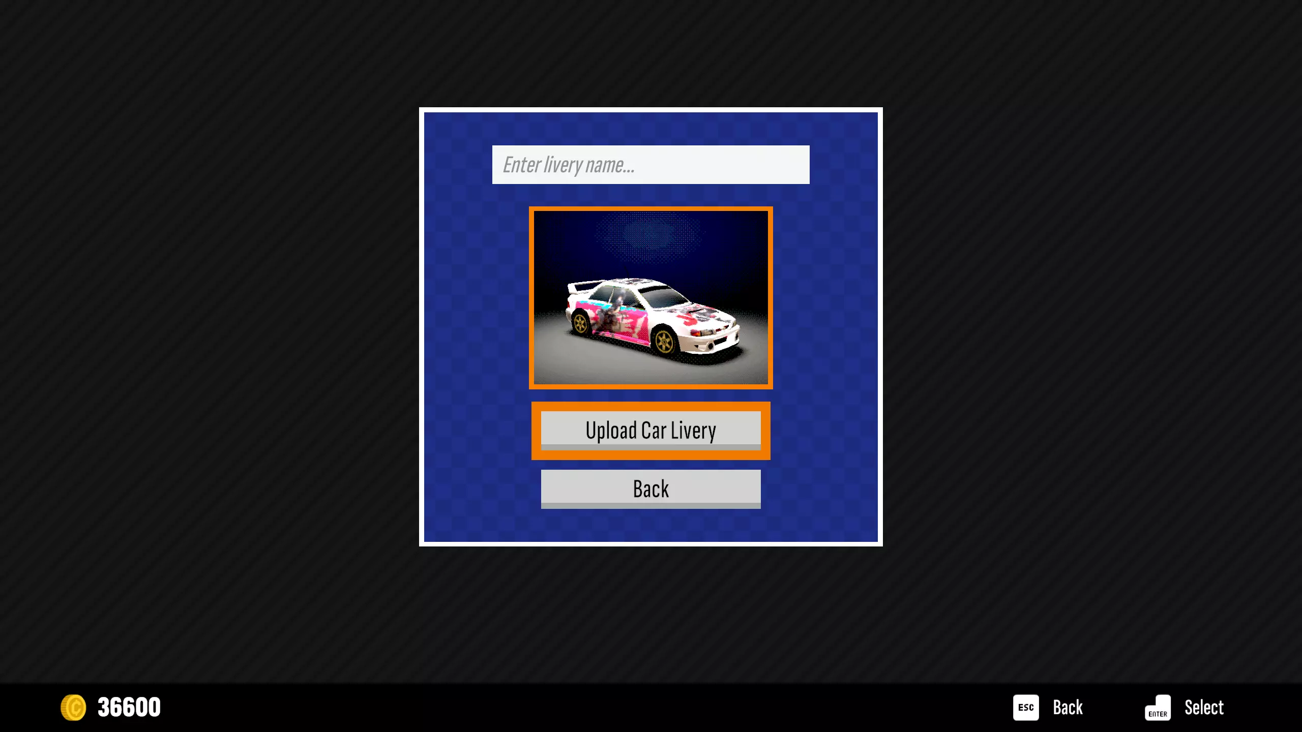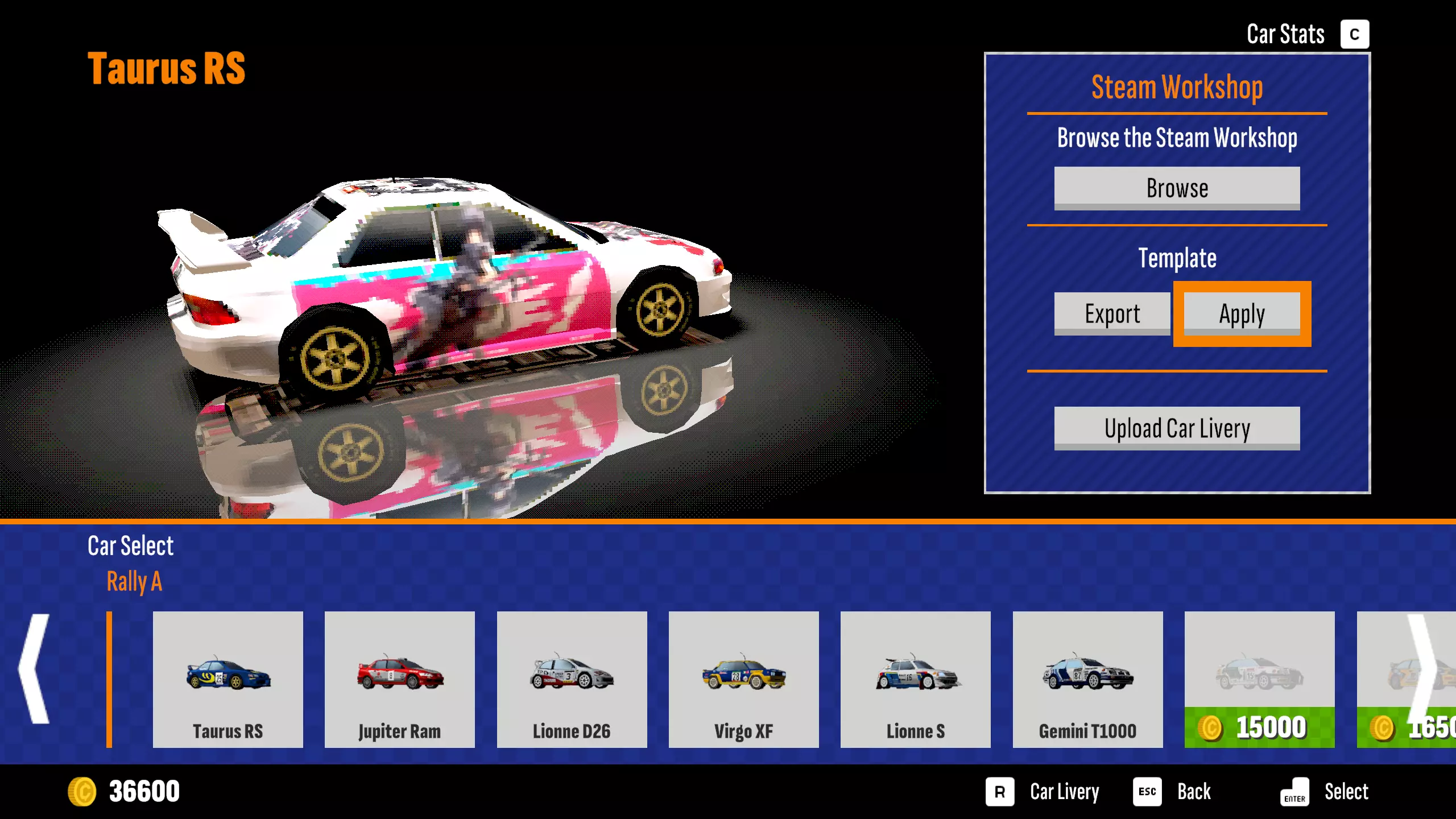 这篇指南将引导大家更方便快捷地制作并上传自己喜欢的车辆外观。 1. 自订车辆外观的制作与上传 首先,进入游戏后任意选择拉力模式或计时模式,进入赛车选择界面。 此时可以通过手柄按键Y(PS手柄按键△),或键盘按键C打开游戏内创意工坊菜单。 按【导出】键导出范本,此时导出的范本存储路径会在右上方显示,默认路径为: C: Users Username AppData LocalLow Frozen Lake Games Old School Rally CustomLiveries