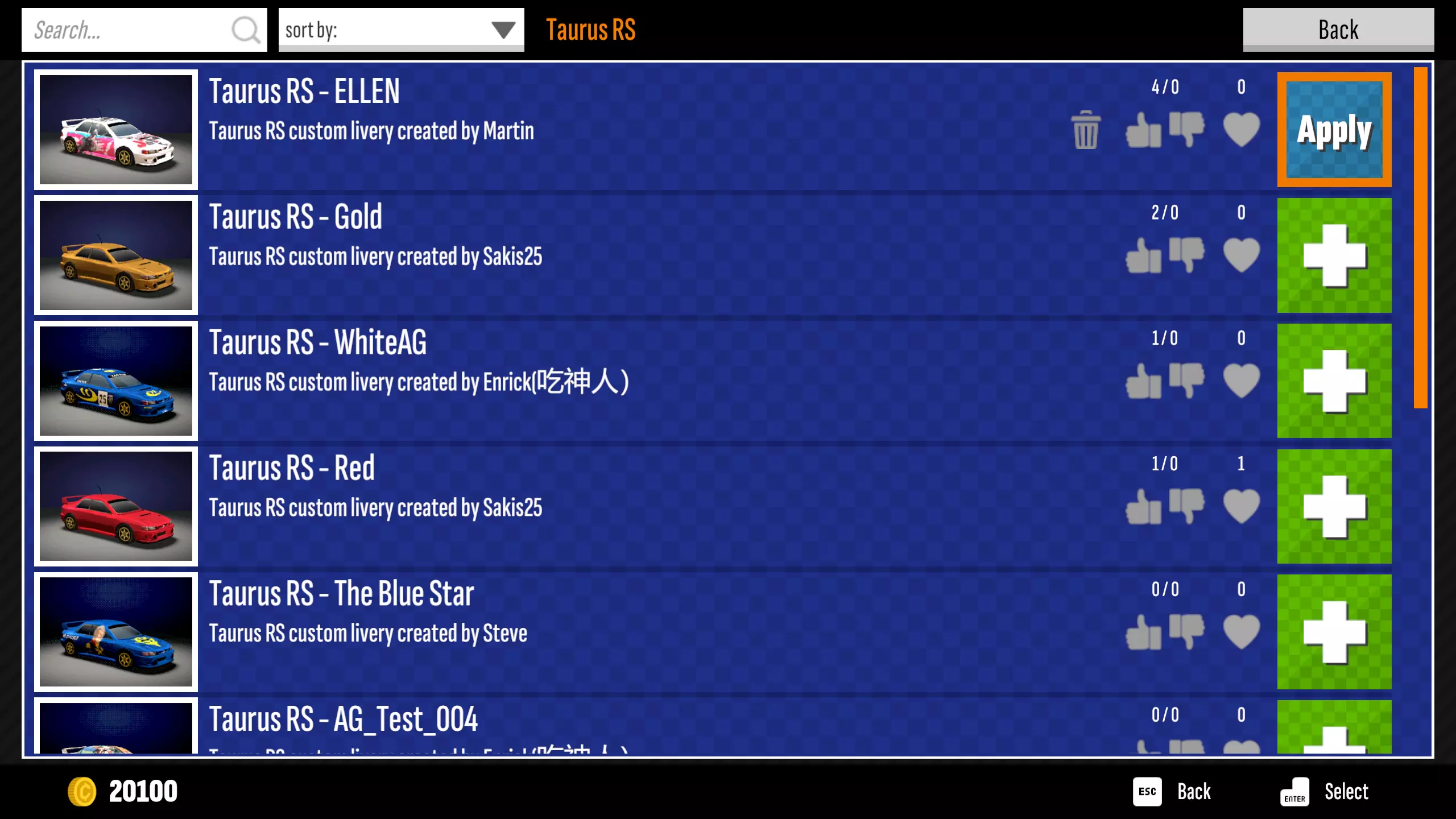 2. 自定义车辆外观的下载与应用 无论您是车辆外观的制作者,还是单纯想要享受社区里的各种个性化外观,都可以参考以下指引。 同样,进入游戏后任意选择拉力模式或计时模式,进入赛车选择界面。 通过手柄按键Y(PS手柄按键△),或键盘按键C打开游戏内创意工坊菜单。 按【浏览】键可以开始浏览当前车辆在社区内的可用外观。 找到想要使用的外观,按下最右侧的【加号】,如果之前已经订阅过该外观,可以直接点击【应用】键。