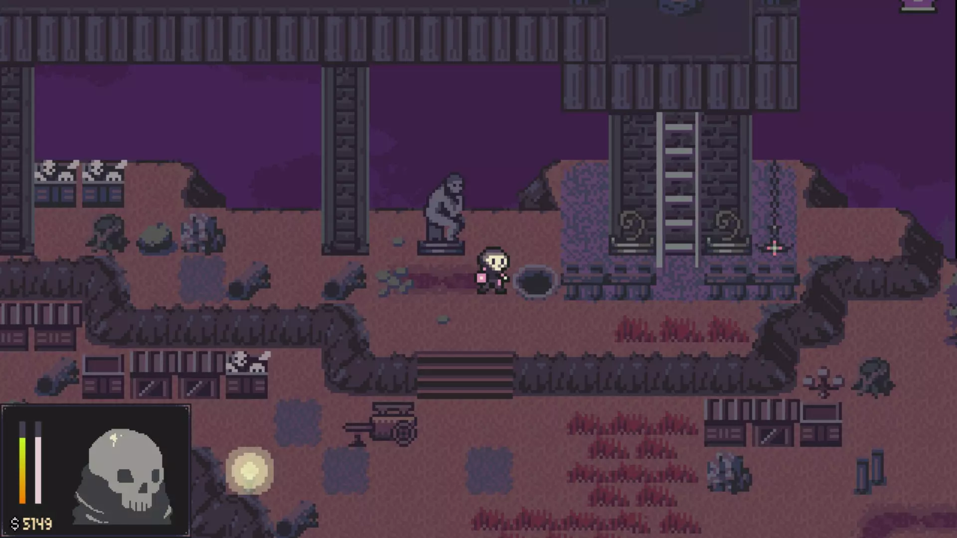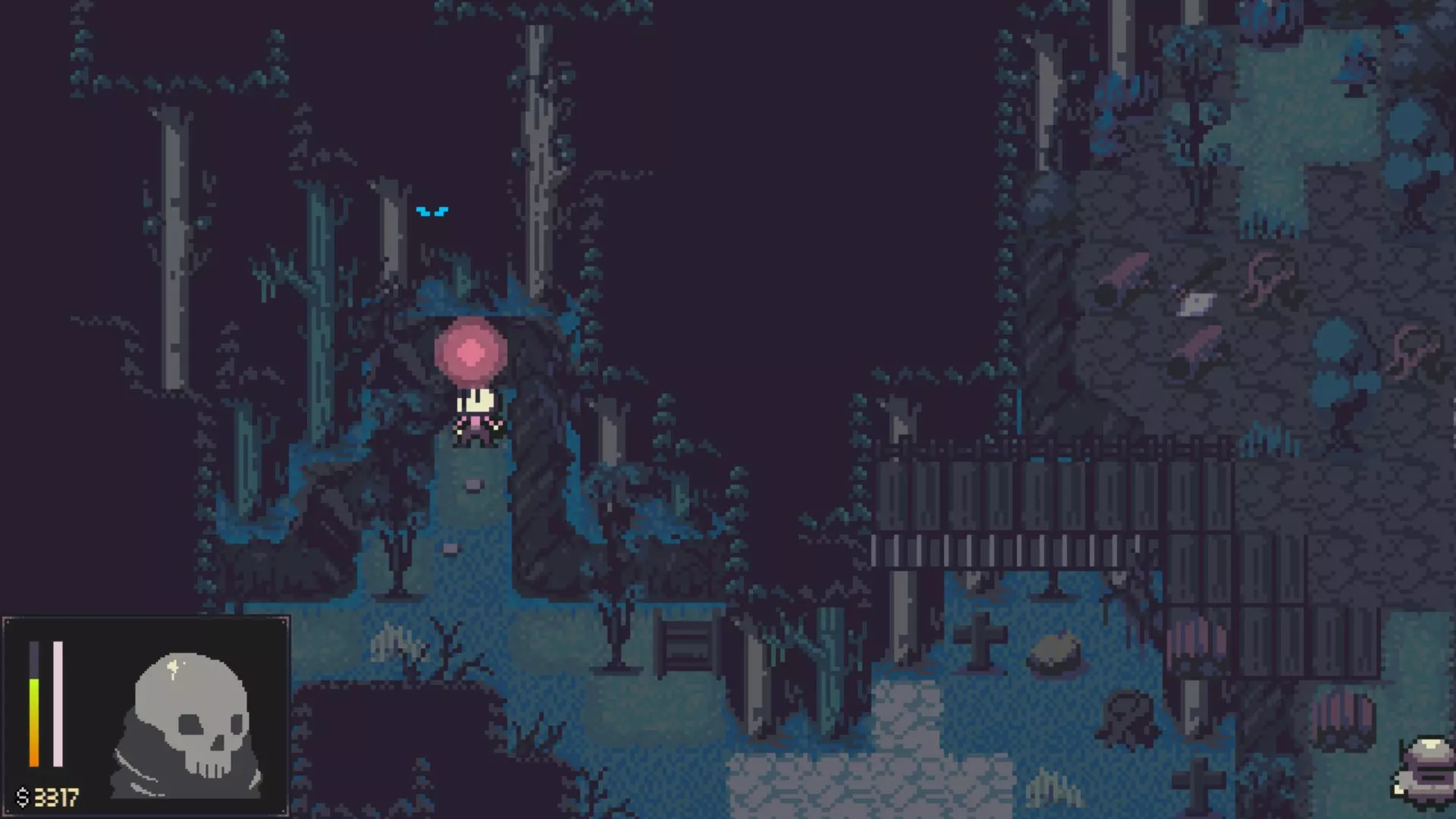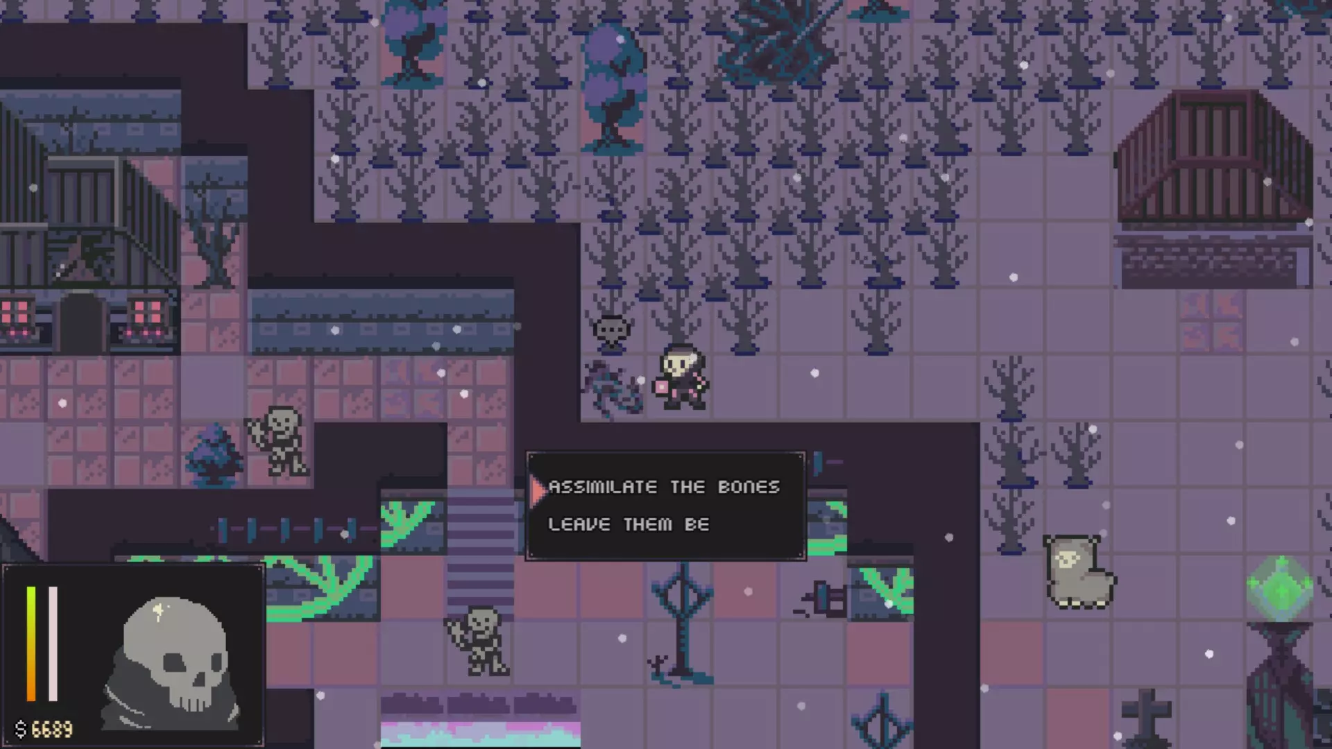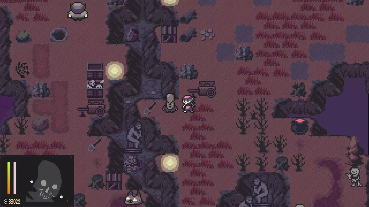 - 你将能够获得另一把镐子。 - 打开南出口附近的箱子。 - 用你的镐子去挖这张地图上的另一块巨石。 - 南出口会通向朱夫拉瀑布,并且从那里无法返回这里。无论你选择哪个出口,都要前往疯狂草地,它可以从拉格马里安废墟向南到达。 疯狂草地- 前往地图的东南部区域,获取一把镐子和两堆骨头,用来融合你的骨头。 - 返回帕普拉斯墓地。 6. 第五章 - 骨城 帕普拉斯墓地- 前往北出口。 枢纽- 解锁所有大门。 - 到东边捡起蜗牛钥匙。 - 参拜雕像。-(完全感知(5/6)) - 与西南部的骨头融合。 - 与薇奥莱塔(那只猫)和女巫猫交谈。 - 前往北出口。挖掘 - 探索该区域寻找宝箱和2把镐子。 - 前往东北角参拜雕像。 - 打碎西北角的巨石。 - 向东走,直到看到人类雕像旁的洞口。参拜雕像,然后通过洞口获取2个宝箱。