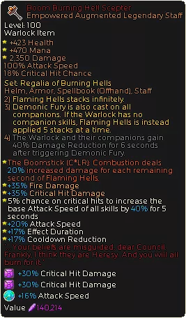 燃烧地狱权杖(传奇)-核心套装部件 Boomstick LR(制作)-这是对我们主要伤害输出者的又一个出色增益,基本上能让其通过叠加【效果持续时间】来提升输出。