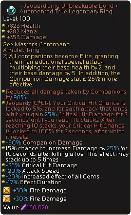 【牢不可破的羁绊】(Unbreakable Bond)TL套装是任何基于伙伴的build的核心套装。【危机】(Jeopardy)GR套装让我们无需在装备上追求暴击率,还能提供大量额外暴击伤害。