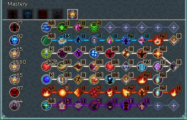 先天概率之冠TL - 能极大提升我们所有被动触发效果,堪称这套Build的核心装备。 露西拉的视野GR - 是我们基础伤害的来源。这个头盔/流派最大的缺点在于伤害层数的叠加和维持完全依赖我们的四个骷髅伙伴,所以回城后别忘了让它们快速攻击假人。 重要提示 - 法力吸取附魔仅在特定阶段需要,因为当你的专精接近3000时,通过触发灵魂盛宴就能获得足够的法力值来维持消耗。此时可以将其重铸成额外暴击伤害或增加受到的治疗量,个人认为治疗量是更好的选择。它会将你的自然续航提升至约49%,治疗之触提升至26%,加上你的击中生命回复,每秒可额外恢复最大生命值的75%! 技能与专精 更新1.31 - 由于皇冠修复,我们受到了小幅削弱。现在我们需要在第二列技能上多投入一些专精点,并且猝死技能无法再达到100%效果。