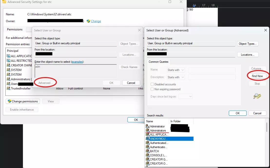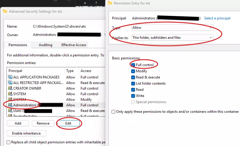 完成后,点击确定返回到显示所有者的高级安全设置窗口,然后点击页面底部的应用。理论上,要以管理员身份打开文件,这应该就是你需要做的全部操作,但我调整了设置以确保拥有完全控制权。因为我第一次这样做时,设置似乎没有生效,游戏仍然时不时出现冻结故障(不过我当时也添加了更多IP地址!)。要执行此操作,你需要关闭并重新打开属性窗口:点击确定,关闭属性窗口,然后重新打开“etc”文件夹的属性窗口。现在像之前一样点击安全选项卡,再次点击高级,你应该会回到显示所有者的页面。在列表中找到你已更改所有者的管理员或用户账户,点击该账户,然后点击编辑。