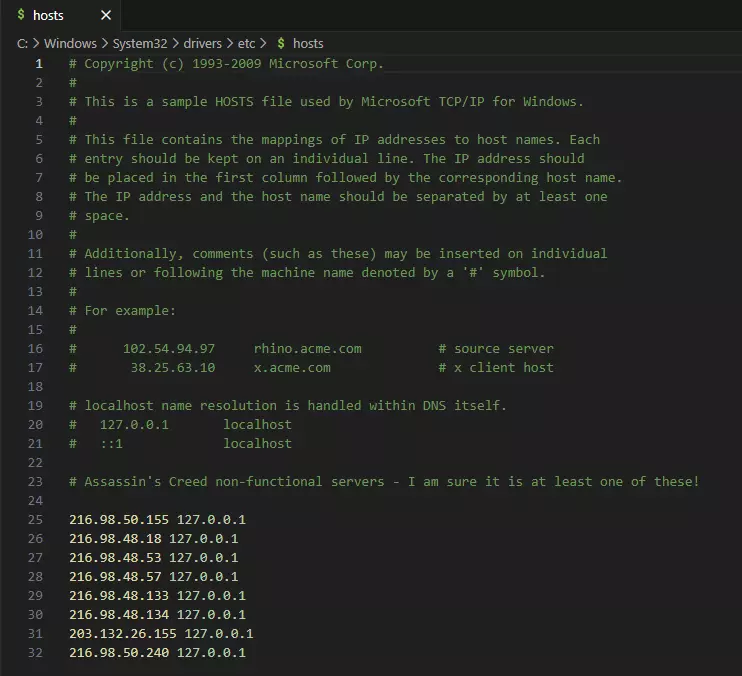 请再次检查你是否正在调整权限以允许访问etc文件夹中的所有子文件,勾选“完全控制”然后点击确定。点击应用(你会收到关于更改系统文件的警告,点击是)。点击确定,关闭属性窗口,你最终就可以编辑hosts文件了!这看起来步骤很多——如果你对调整计算机文件有一定熟悉度,2分钟内就能完成。请注意,这只会让你获得调整“etc”文件夹中文件的权限,而非设备的其他部分。 修复方法 - 第二部分 使用你偏好的编辑器打开hosts文件——我使用“Visual Studio Code”,因为我安装了它用于其他事情,但对于调整这样的小文件,“记事本”也完全可以。你需要在文本文件的底部添加以下行。如果你好奇的话,这里有个小知识——井号(#)以及同一行中井号后面的所有内容都被视为“注释”。这意味着同一行中的任何文本都不会被当作代码读取。你会注意到文件中当前所有行都带有井号,这表示它们目前没有任何作用。注释只是帮助你识别可以添加代码的区域,让你知道自己做了什么、在哪里做的以及代码的功能。你可以在末尾添加我在下方提供的注释(或者只添加地址),也可以完全删除文件中当前的所有文本,这取决于你! 话虽如此,以下信息中唯一需要保持正确的是数字和点,并且在IP地址的末尾与127.0.0.1的开头之间要有一个空格。# 《刺客信条》服务器无法正常运行 - 我确定至少是其中之一! 203.132.26.155 127.0.0.1 216.98.48.18 127.0.0.1 216.98.48.53 127.0.0.1 216.98.48.57 127.0.0.1 216.98.48.133 127.0.0.1 216.98.48.134 127.0.0.1 216.98.50.155 127.0.0.1 216.98.50.240 127.0.0.1