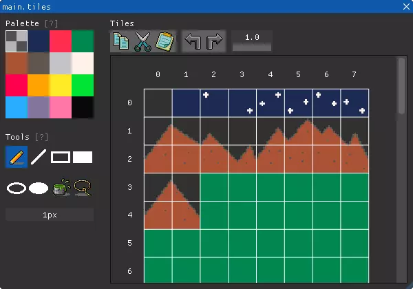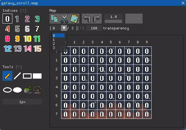 操作 MAP m, x, y, r = 0:在特定位置绘制一个或多个地图图层。 加载函数会返回一个图层列表。将整个列表或单个图层传递给此MAP函数的m参数进行渲染,此函数不渲染逻辑标记。 尝试以下代码: layers = load_resource("galaxy_scroll.map") def update(delta) map layers, 0, 0 enddef update_with(driver(), call(update)) 这等效于: layers = load_resource("galaxy_scroll.map") layer1 = get(layers, 1) layer2 = get(layers, 2) layer3 = get(layers, 3) def update(delta) map layer1, 0, 0 map layer2, 0, 0 map layer3, 0, 0 enddef update_with(driver(), call(update)) 获取、设置瓦片 这些函数用于获取和设置地图的瓦片。它们适用于来自磁盘资源或空白的地图。详细信息请阅读手册: MGET m, i, x, y MSET m, i, x, y, v 自动排序 SET_ORDERBY(drv, rule ...):设置图形命令的排序规则;不调用此函数时默认为“nil”。rule ... 可以是“nil”“map”“spr”“all”中的一个或多个;“all”是“spr”和“map”的快捷方式,本指南仅解释“map”。 有时我们需要指定多个对象的渲染顺序,只需很少的代码修改即可实现。调用上述带有“map”参数的函数后,BASIC8 将根据队列索引自动对所有地图图层、精灵和其他图元按以下从上到下的顺序进行排序: 0. 地图的第1层 1. 地图的第2层 2. 精灵 3. 地图的第3层 4. 其他形状图元,如圆形(CIRC)、矩形(RECT)等在“map”排序模式下,你可以指定量化图像的队列索引,详情请阅读手册。 尝试以下代码并进行调整: set_orderby(driver(), "map") ' 注释此行以查看差异。 galaxy_scroll = load_resource("galaxy_scroll.map") spaceship = load_resource("spaceship.sprite") spaceship.play() x = 8 y = 56 v = 20 def update(delta) if btn(0) then x = x - delta * v elseif btn(1) then x = x + delta * v elseif btn(2) then y = y - delta * v elseif btn(3) then y = y + delta * v endif map galaxy_scroll, 0, 0 spr spaceship, x, y enddef update_with(driver(), call(update))