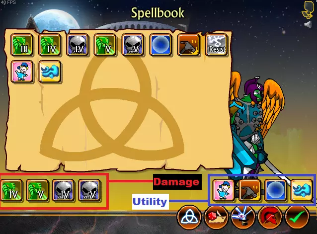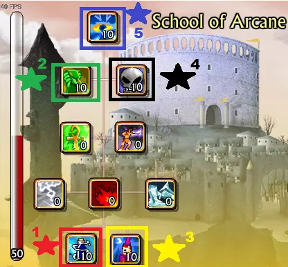 戏剧学派在战斗间隙提升角色能力时非常有用。我强烈建议投资【商业学】(紫色)或【考古学】(粉色)。两者都能让你稳定获得高端装备。前者与金钱相关,后者则与良好的商店随机数生成有关。 生存学派和戏剧学派各有其用武之地。选择哪一个(或者两者都选)取决于你自己的判断以及对刷级的耐心。 法术 没有法术的巫师算什么巫师?当然不是个好巫师。 尽早获取一些法术!用你的第一笔1000金币,你应该投资一个1级伤害法术(我选了毒药,但你可以选任何你喜欢的)。我建议至少配备4个伤害法术(例如2个毒素法术和2个死灵法术)以及4个辅助法术,无论效果好坏。这就是游戏后期你的施法界面应有的配置。