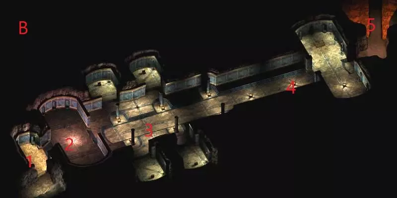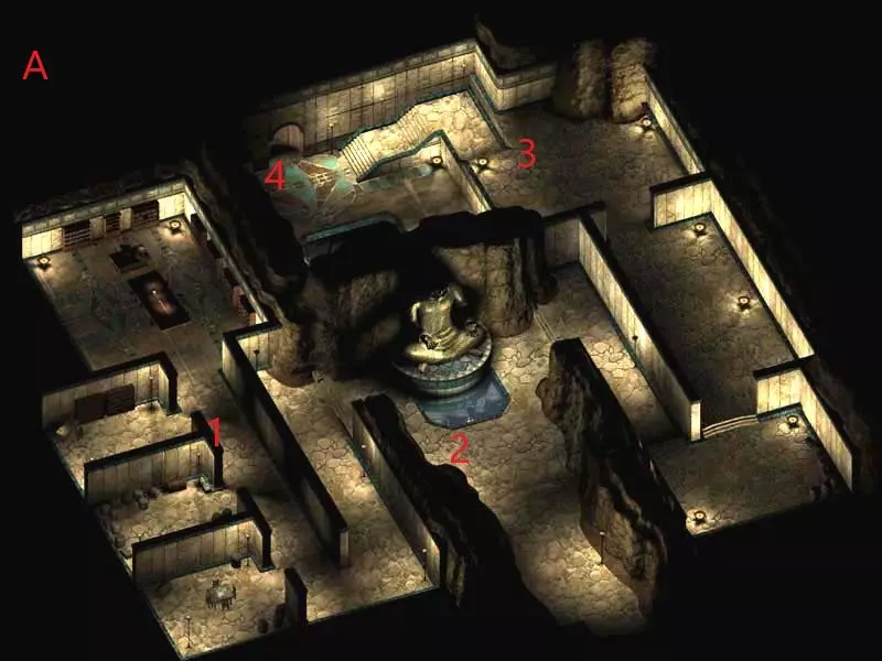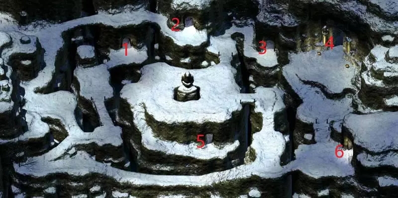 1 - 一号墓穴 2 - 二号墓穴 3 - 三号墓穴 4 - 通往黑狼神殿的出口 5 - 雪人首领与莱桑 6 - 四号墓穴 在外面,你会遇到雪人和小型阴影生物。搜索所有墓穴(你会在里面发现各种各样的尸体),因为你能找到许多有趣的物品和钥匙。尤其要小心陷阱。这个区域还有一个洞穴,你可以在那座巨大雕像的下方找到它。进入洞穴前,你会遇到雪人首领——他持有米雷克的家族纪念物。洞穴里仍有一只雪人和许多有趣的物品。现在前往最大的那座墓穴。一场艰难的战斗在等着你,而且这座墓穴有三层。这会很困难,但请注意:在第一层你会遇到一个名叫迈托斯的访客。在对话中,尝试说服他你怀有和平意图并希望避免战斗,你将获得一些额外经验。但最终你还是必须杀死他。在这一层,你还会遇到【米尔寇信使】。你只能用魔法武器杀死他。通往第二层的入口在【迈托萨】房间的腿部位置。一直走,直到你到达大厅,随后会遇到【野蛮人之王克雷瑟拉克】的灵魂。他会告诉你,如果你帮他一个忙(并非无偿),他就会回答你的问题。你必须杀死女祭司【奥里尔】。她位于曾有雪人的洞穴中。然而,事实证明她是酒馆里的其中一个酒保(【莉珊】)。完成她(和她的保镖)的任务后,返回克雷瑟拉克处,告诉他事情已经解决。作为奖励,他会允许你搜索他的坟墓。现在回到阿伦德尔那里,告诉他你在暗影谷的发现,他会送你前往遗忘之神神殿。但在出发前,先回去找米雷克完成他的任务,再去酒馆找酒保,告诉他山谷里发生的冲突,并索要女祭司的物品。之后你就可以前往下一个地点了。 遗忘之神神殿 这座神殿与其他神殿相比不算很大。你会遇到侍僧和维比格巨人,并能找到许多有用的物品。一路挥剑战斗,直到抵达第三层。在其中一具尸体上,你会找到一个药瓶,需要将其带给阿伦德尔。大德鲁伊这次会派你去龙眼执行另一项任务。