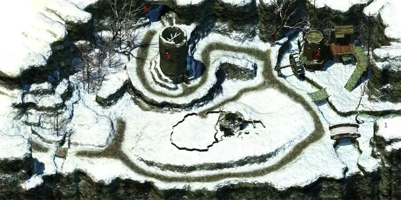 1 - 入口 2 - 一些敌人 3 - 道具 4 - 更多敌人 5 - 前往3层