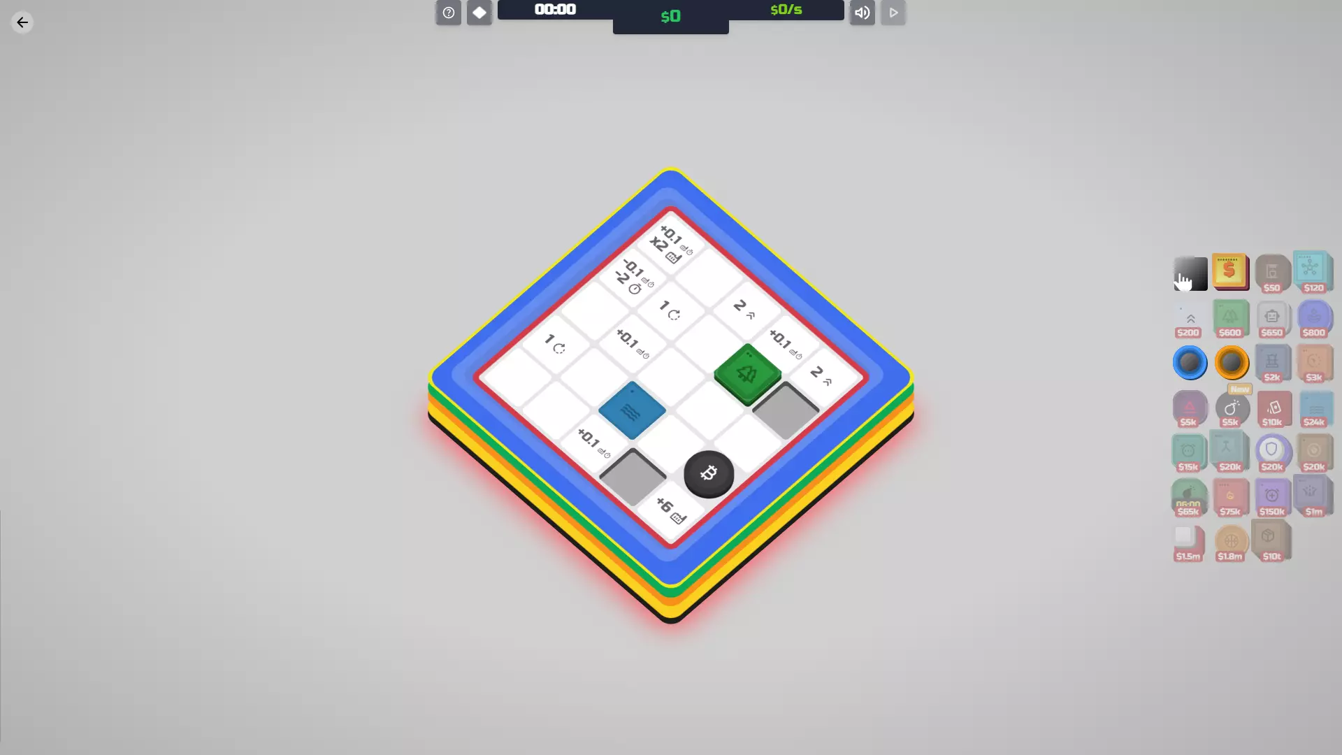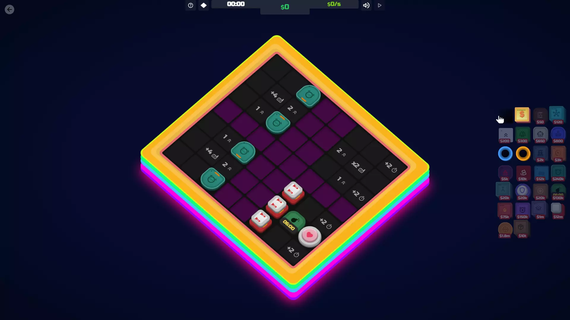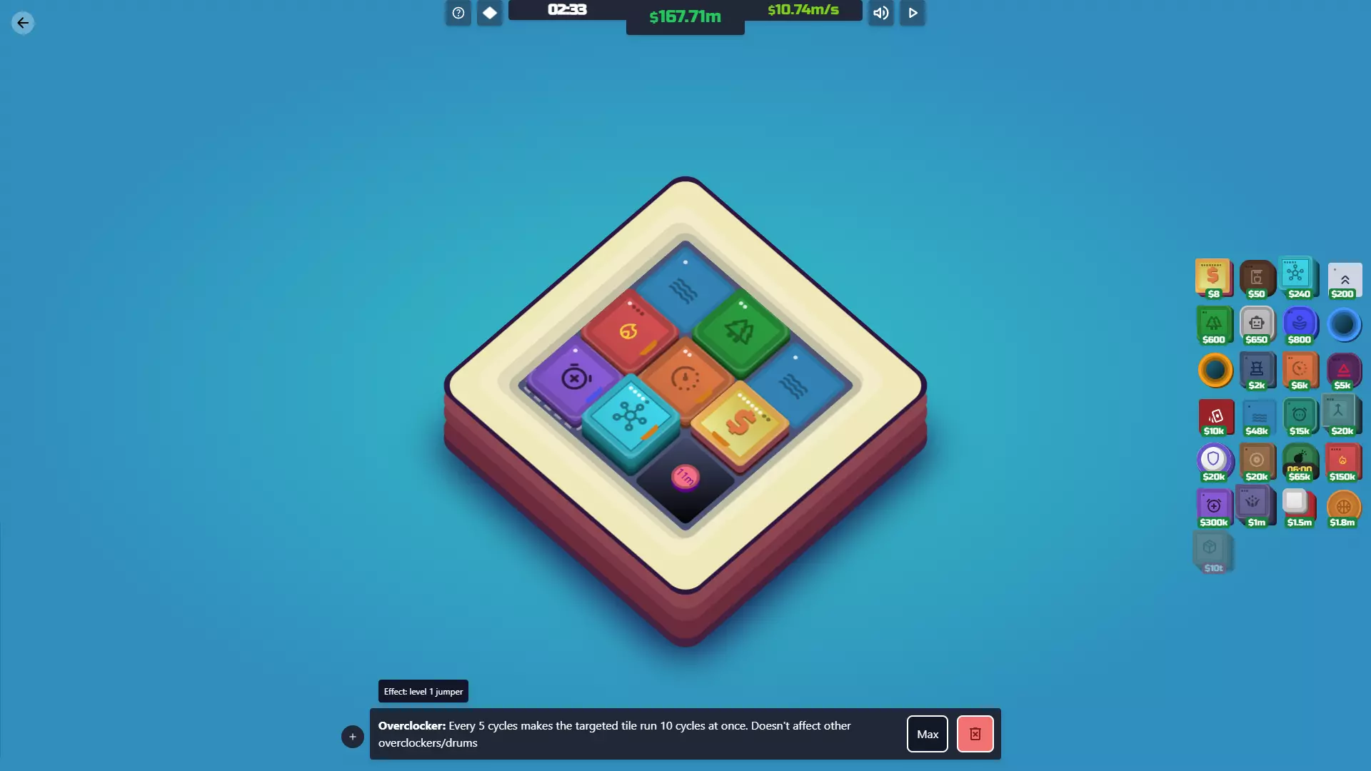 【减速装置】解锁条件:在神秘空间03地图上摧毁减速装置地砖,然后在同一地图上重新放置它。如果不放置,将无法解锁!你也可以等待定时炸弹将其炸毁。 功能:通过延迟地砖的周期来减少其运行频率。如果你觉得这听起来没什么用,那你是对的。它仅在延迟定时炸弹或比特币等负面地砖时才真正有用。 遗憾的是,即使升级后,它提供的周期延迟效果也非常差。你真的最好攒资源通过其他方式移除那些地砖。 成本 等级 效果 等级1 每5个周期延迟目标地砖1个周期。 升级成本10000美元 等级2 每4个周期将目标方块延迟1个周期。 30000美元 协同效果 定时炸弹:延迟定时炸弹的倒计时。 导弹:延迟导弹发射,但延迟幅度不大。 钻头:延迟钻头破坏方块。 比特币:延迟比特币增殖。不过通常直接删除它们更简单。 鼓/超频器:可以用这些来提高降频器的激活频率。如果数量足够,甚至能让定时炸弹的倒计时增加!