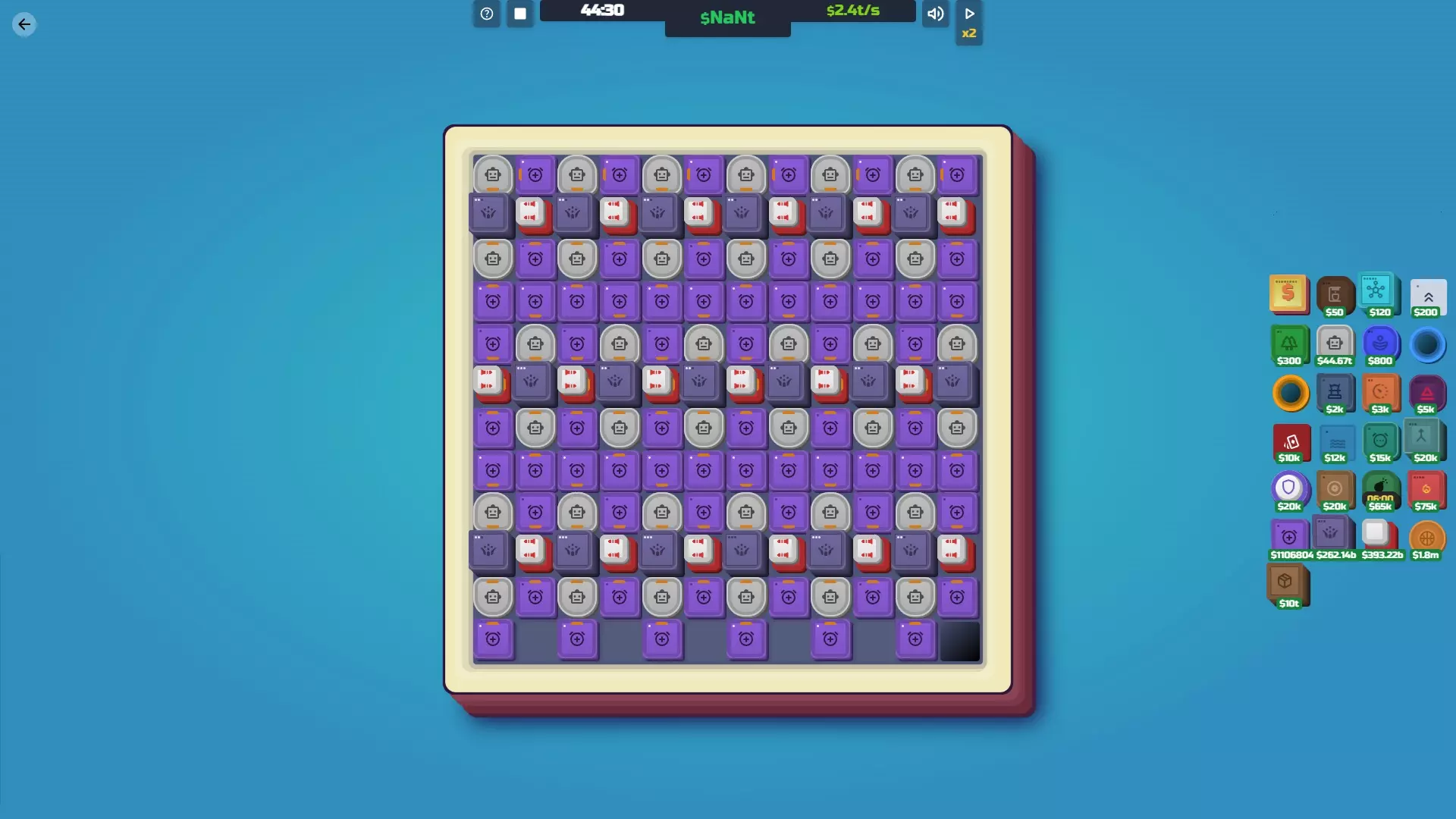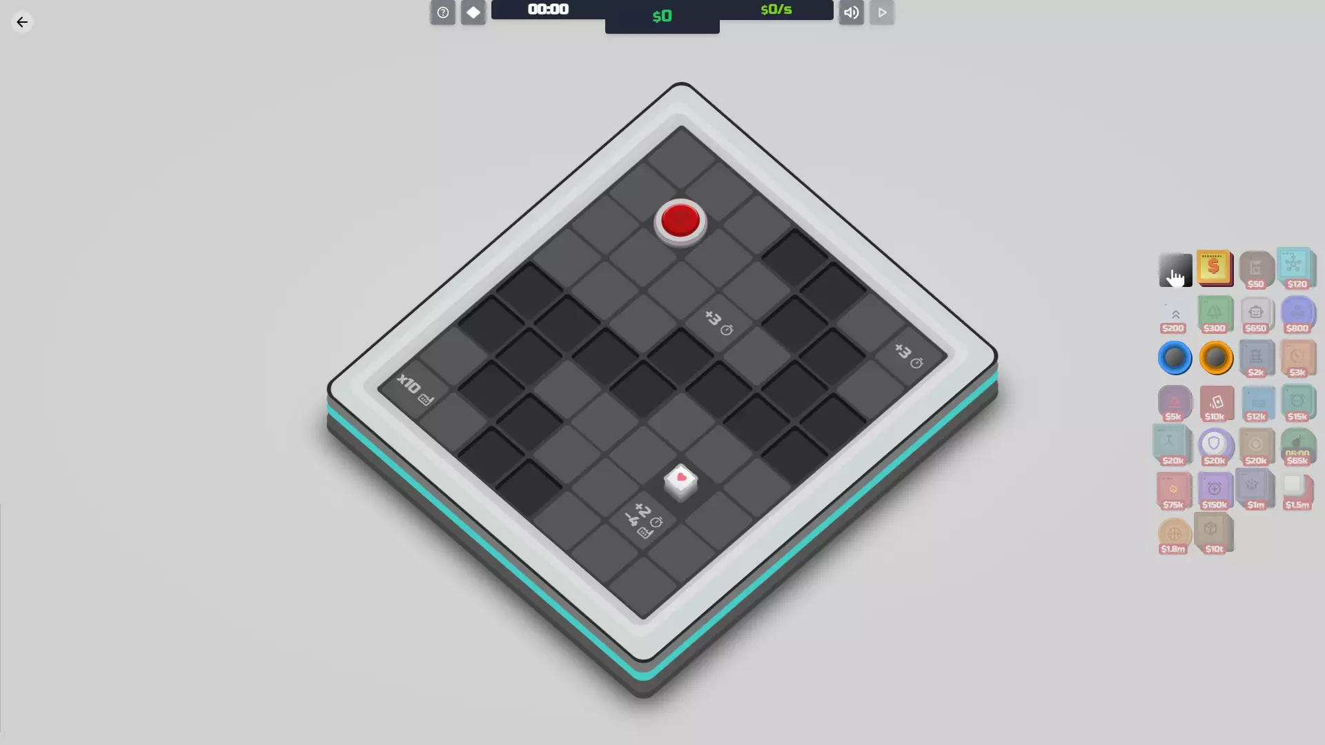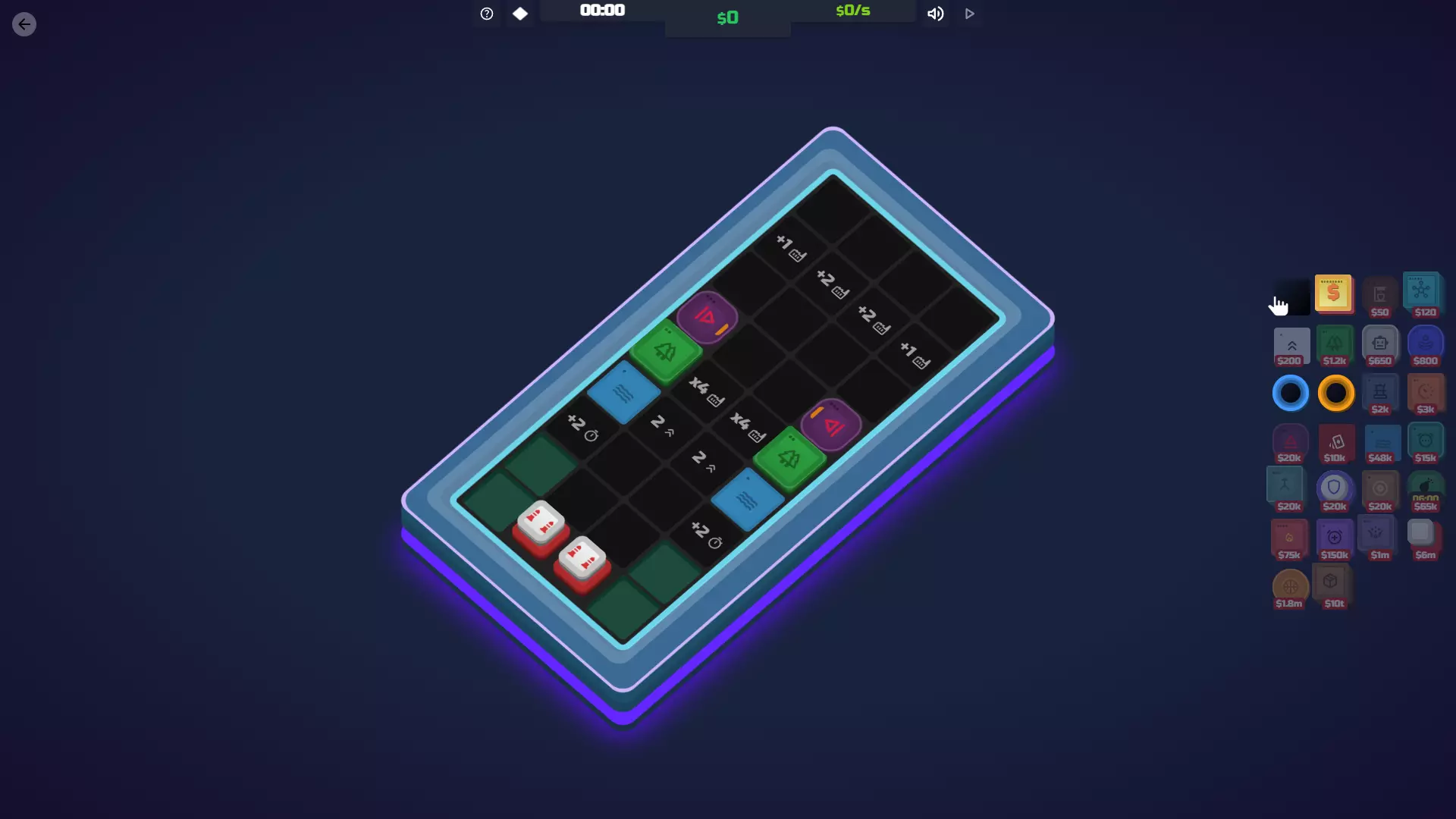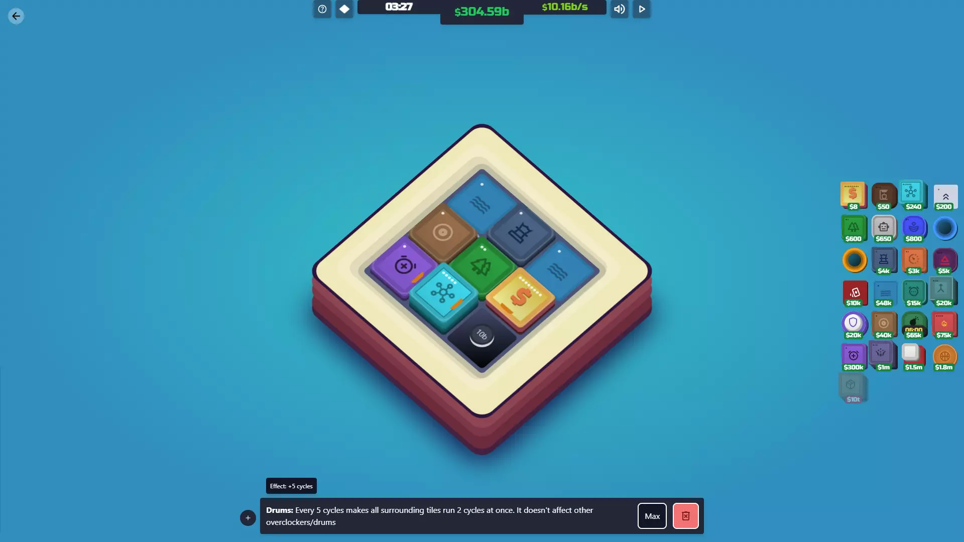 【减速装置】解锁条件:在神秘空间03地图上摧毁减速装置地砖,然后在同一地图上重新放置它。如果不放置,将无法解锁!你也可以等待定时炸弹将其炸毁。 功能:通过延迟地砖的周期来减少其运行频率。如果你觉得这听起来没什么用,那你是对的。它仅在延迟定时炸弹或比特币等负面地砖时才真正有用。 遗憾的是,即使升级后,它提供的周期延迟效果也非常差。你真的最好攒资源通过其他方式移除那些地砖。 成本 等级 效果 等级1 每5个周期延迟目标地砖1个周期。 升级成本10000美元 等级2 每4个周期将目标方块延迟1个周期。 30000美元 协同效果 定时炸弹:延迟定时炸弹的倒计时。 导弹:延迟导弹发射,但延迟幅度不大。 钻头:延迟钻头破坏方块。 比特币:延迟比特币增殖。不过通常直接删除它们更简单。 鼓/超频器:可以用这些来提高降频器的激活频率。如果数量足够,甚至能让定时炸弹的倒计时增加!