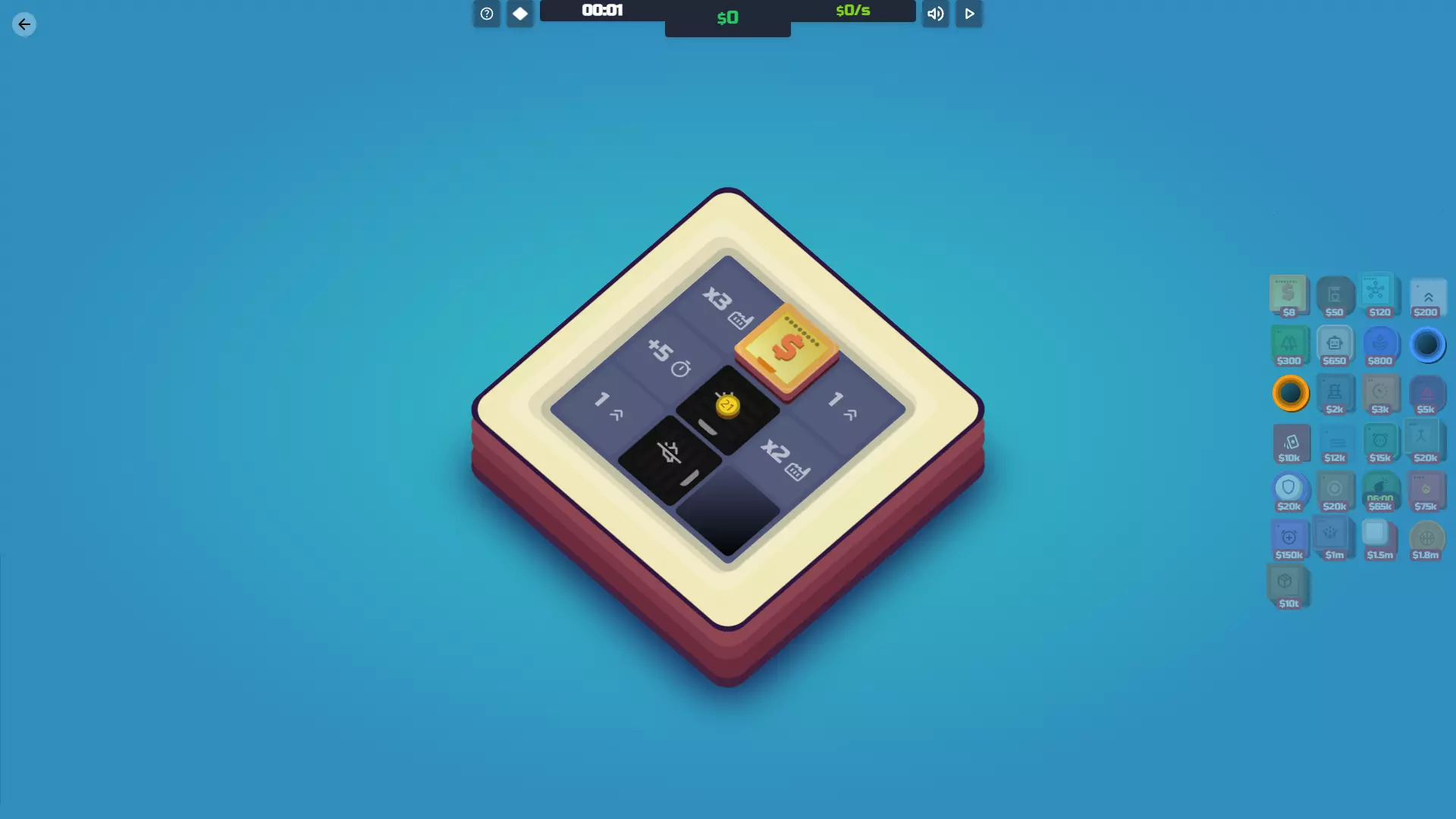 在5分钟内赢得一局游戏 这才是真正困难的地方,可能也是你打开本指南的初衷。5分钟很难,一开始可能看起来完全不可能。 不过这完全可以做到。我目前的最快时间是普通难度3分10秒,硬核难度3分36秒。查看我的其他指南,获取一些提示和技巧,以及每个方块的协同效应解释。这些应该能给你一个良好的开端。 每日和夜间地图是尝试5分钟目标的好地方,不过并非所有地图都适用。它们之所以合适,是因为拥有大量的方块加成,这是完成这个挑战所必需的。另一张有很多方块加成的地图是? 3x3 这是我取得最低时间的地图,也是我最喜欢的地图。这款游戏有多种玩法,但要密切关注所有格子的加成效果。 提示1 你的产出可以放在任意一个跳跃器或每周期+0.1产量的格子上。这听起来可能有些疯狂,但中心格子有每周期+1产量的加成,所以你并不需要依赖那些格子。 提示2 一旦达到50美元,立即在中心格子使用咖啡,然后尽快用加速器替换它。 提示3 整个游戏过程中,你只需要1个工厂和1个中心设施,但一开始可以放置几个,之后根据需要调整它们的位置。 提示4 产量倍率格子在游戏初期不如固定+20产量的格子有用,但很快+20产量就会变得无足轻重。 提示5 需要时尽管删除物品。你应该每隔几秒就暂停游戏并重新配置布局。提示6 由于你只需要1座工厂,在你能够负担其最终升级之前,招募投资者毫无意义。这听起来可能有些疯狂,但过早招募确实是浪费空间。 解决方案 以下是一种能在5分钟内完成该地图的方法。它并非最高效的方式,但操作简单且能帮助你达成目标。