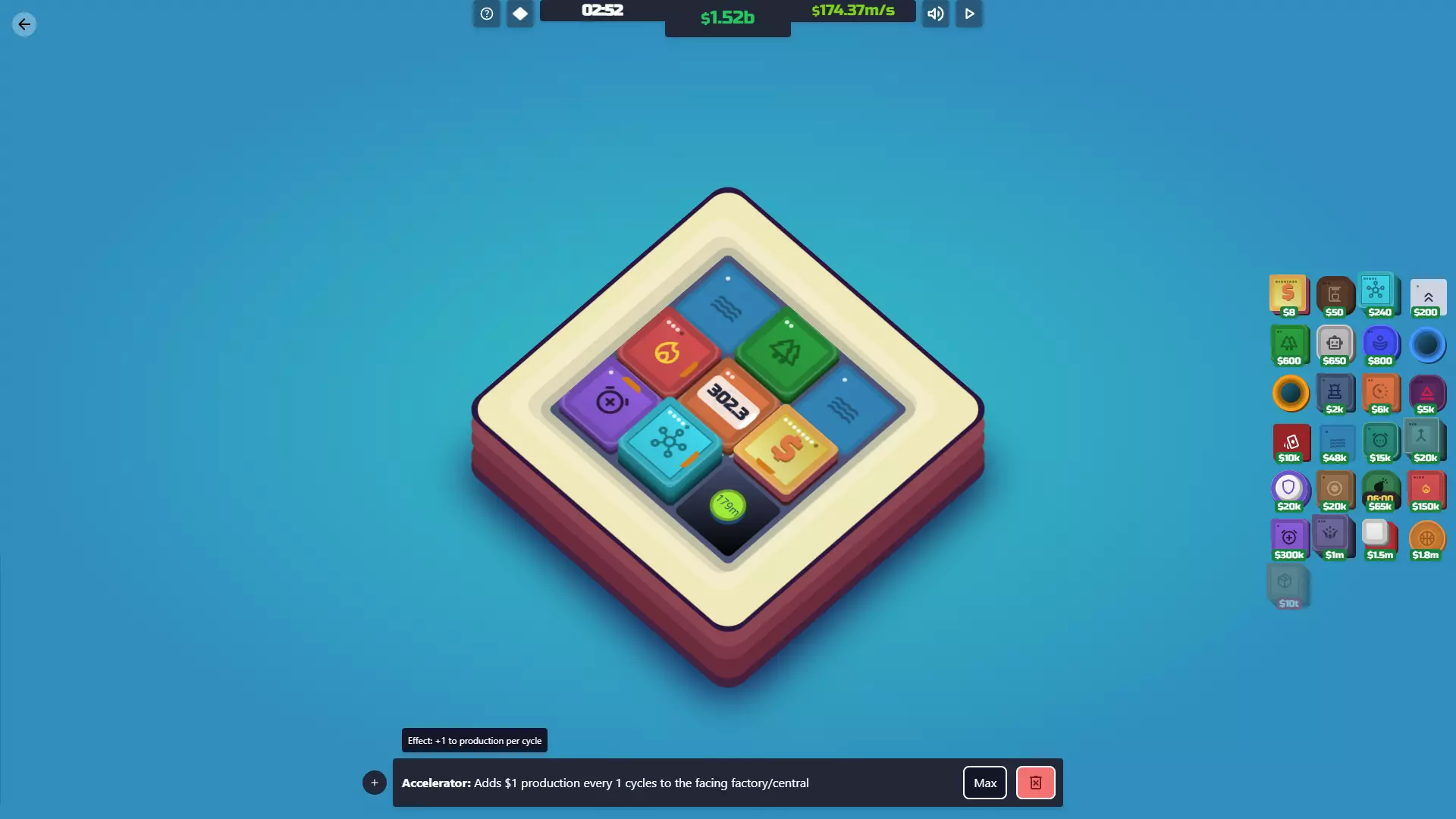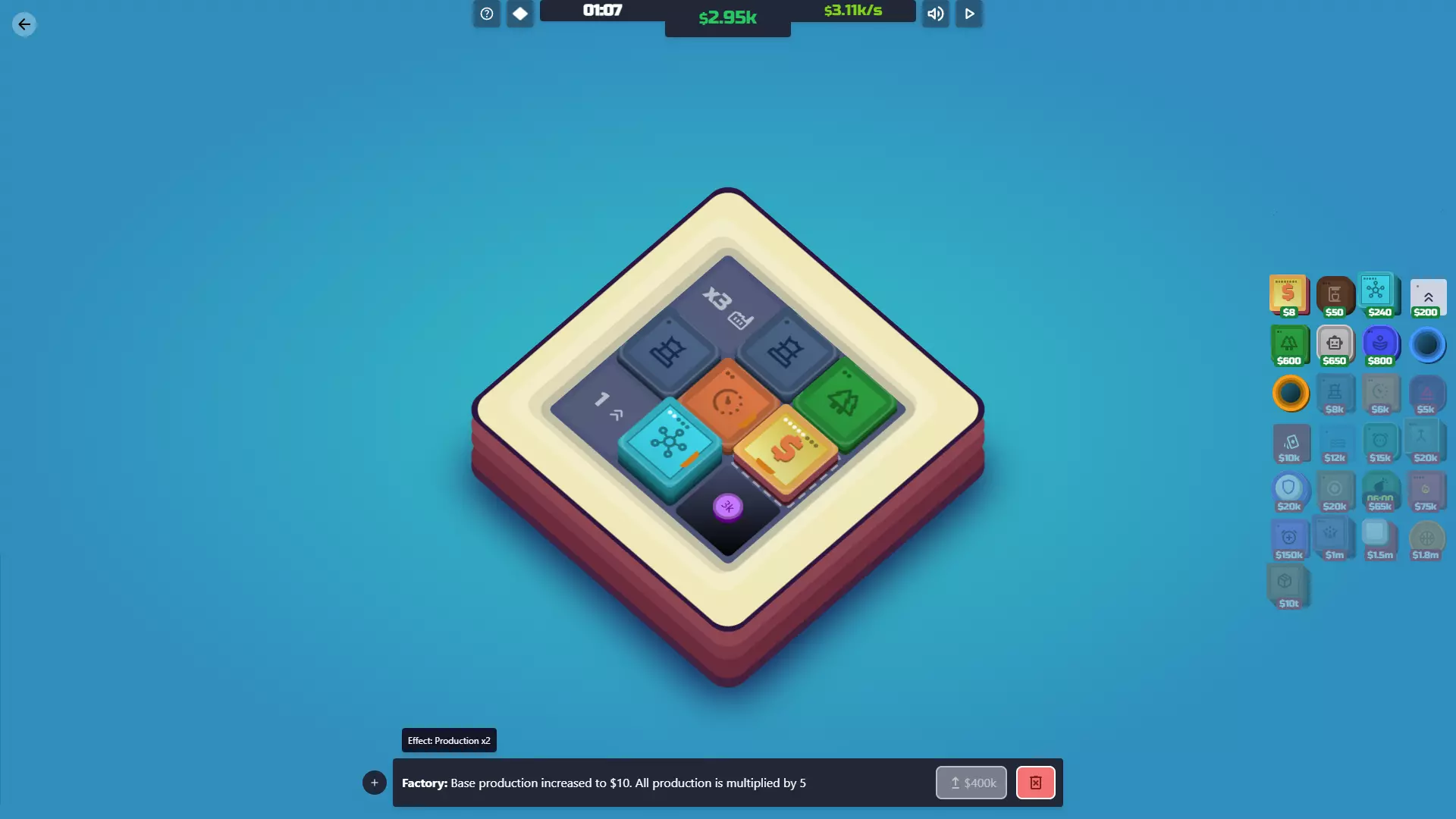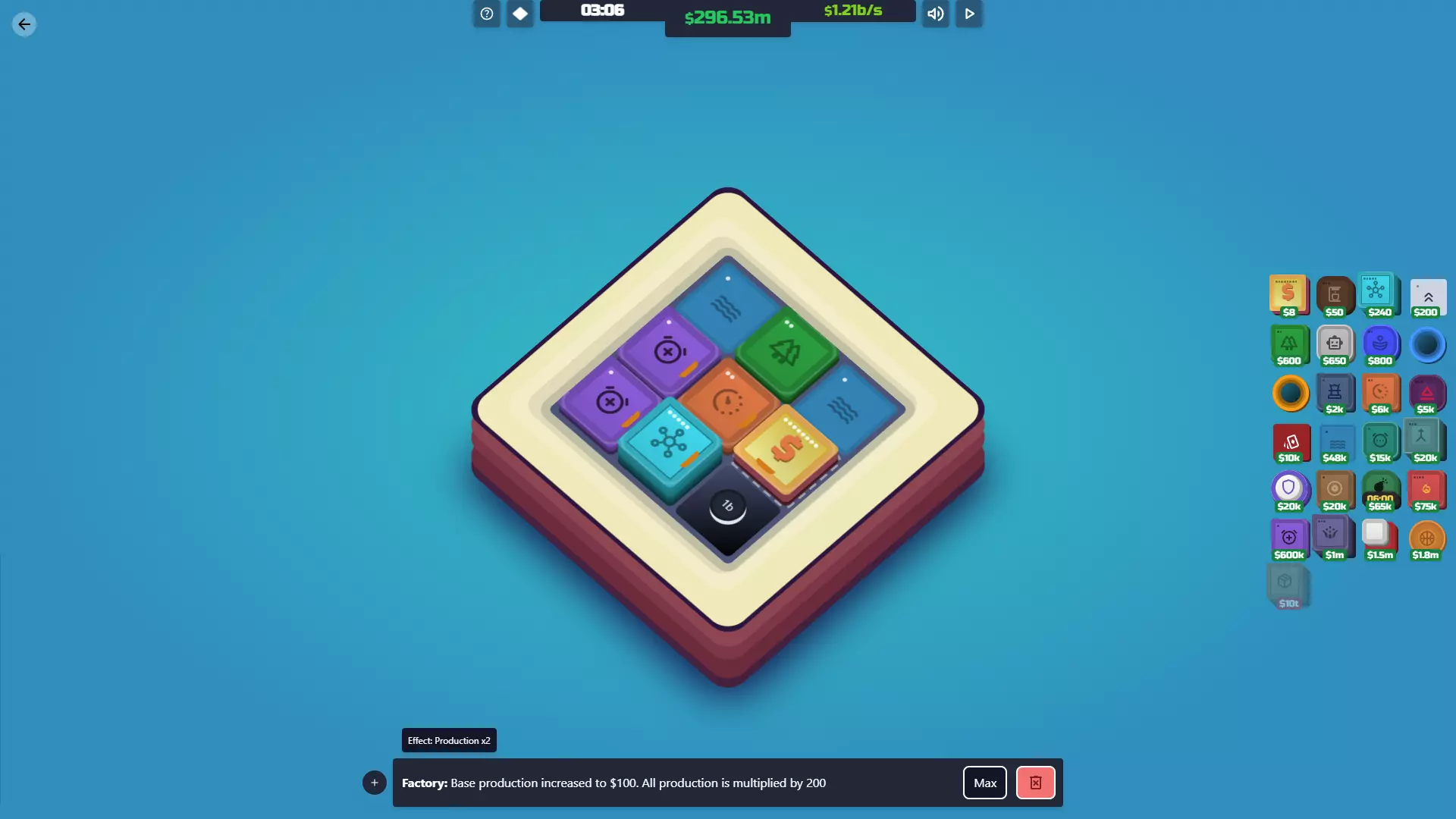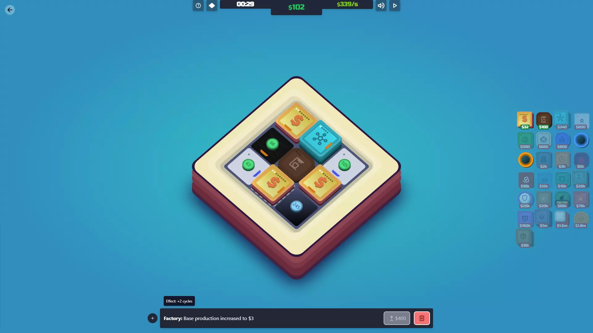 【投资者已解锁】放置你的第一个超频器瓷砖。 功能:投资者就像是升级版的加速器,但它们能提升整个地图上所有工厂和中心的产量。简单来说:你需要它们来赢得游戏。 一旦你拥有100万美元,这通常应该是你的首要购买目标。唯一不太适用的情况是,如果你花了大量时间提升加速器的加成,且只有1到2个工厂/中心。这时你可以先不着急购买投资者,直到能完成最后一次升级。 说到升级:初期升级速度非常快。一旦你有了100万美元,很容易就能达到500万美元和4000万美元,所以要密切关注你的投资者。升级的效果非常好,所以只要有机会就进行升级。下一次升级需要巨额的3000亿美元,这是游戏中最昂贵的升级。不过,这正是你获胜的方式。1%的产量提升看似不多,但它会呈指数级增长,因此你很快就能购买【Box】。 成本 等级 效果 每次升级成本 100万美元 1级 每5个周期为每个工厂/中心增加1美元产量 500万美元 2级 每3个周期为每个工厂/中心增加2美元产量 4000万美元 3级 每2个周期为每个工厂/中心增加3美元产量 3000亿美元 4级 每1个周期为每个工厂/中心增加1%产量 协同效应:工厂/中心——无论它们在地图上的哪个位置,都会提升这两者的产量。这让你可以自由地将投资者放置在最有帮助或不碍事的位置。 火营:对投资者的作用与对加速器相同,但投资者会影响每个工厂/中心。不过,火营对投资者的最终等级无效——即使瓷砖顶部的数字显示并非如此。4级投资者总是增加1%。 鼓/超频器:这些能让投资者更频繁地运作,从而更频繁地增加生产收益。尤其是当你达到4级时,用这些围绕投资者会让你的指数增长更快。 倍增器瓷砖2