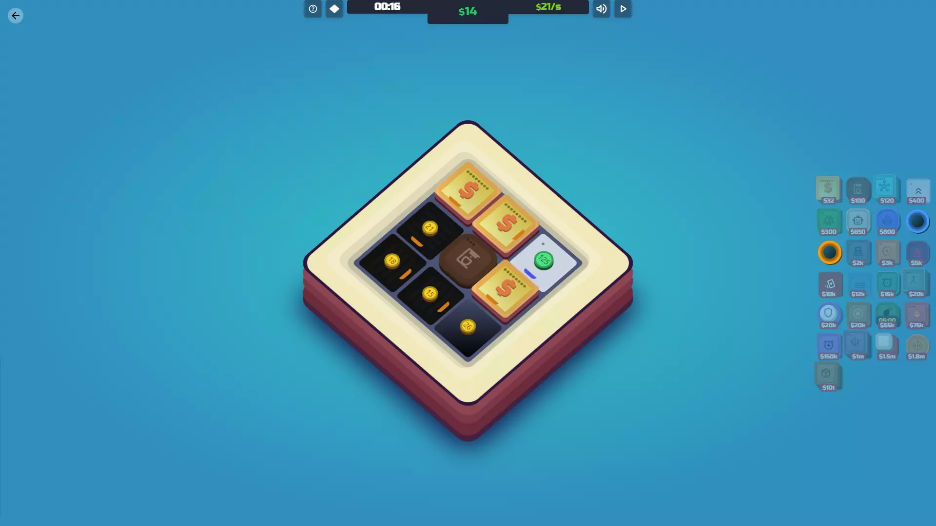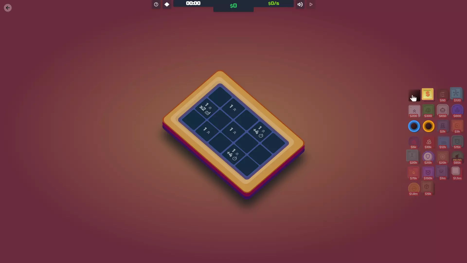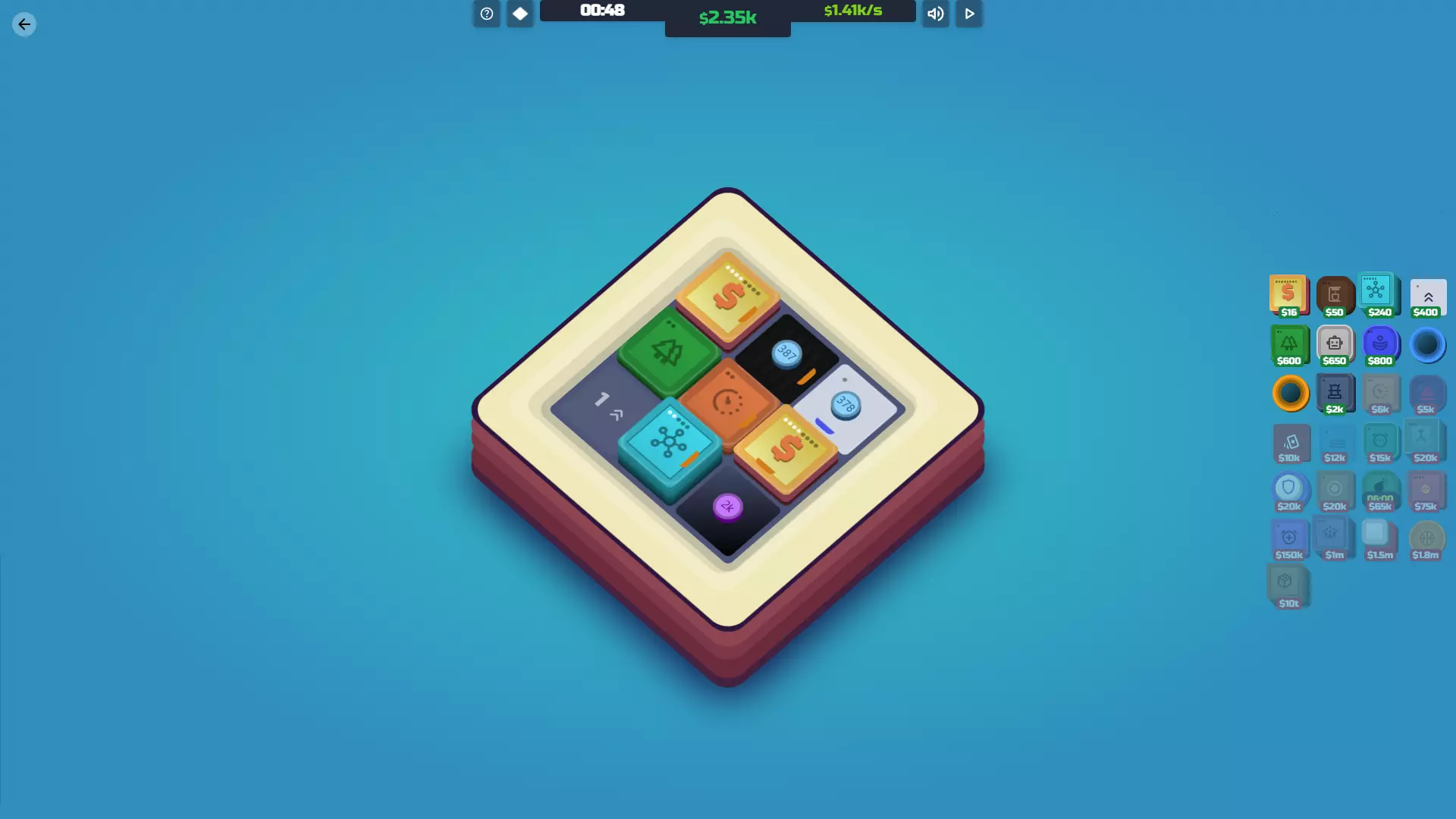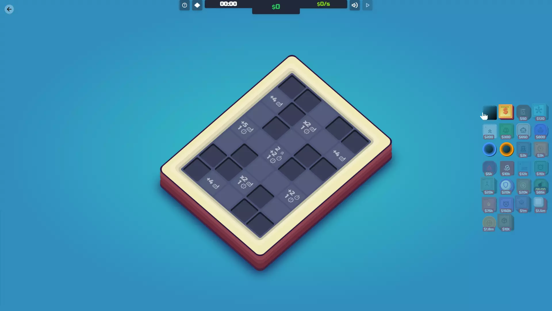 【投资者已解锁】放置你的第一个超频器瓷砖。 功能:投资者就像是升级版的加速器,但它们能提升整个地图上所有工厂和中心的产量。简单来说:你需要它们来赢得游戏。 一旦你拥有100万美元,这通常应该是你的首要购买目标。唯一不太适用的情况是,如果你花了大量时间提升加速器的加成,且只有1到2个工厂/中心。这时你可以先不着急购买投资者,直到能完成最后一次升级。 说到升级:初期升级速度非常快。一旦你有了100万美元,很容易就能达到500万美元和4000万美元,所以要密切关注你的投资者。升级的效果非常好,所以只要有机会就进行升级。下一次升级需要巨额的3000亿美元,这是游戏中最昂贵的升级。不过,这正是你获胜的方式。1%的产量提升看似不多,但它会呈指数级增长,因此你很快就能购买【Box】。 成本 等级 效果 每次升级成本 100万美元 1级 每5个周期为每个工厂/中心增加1美元产量 500万美元 2级 每3个周期为每个工厂/中心增加2美元产量 4000万美元 3级 每2个周期为每个工厂/中心增加3美元产量 3000亿美元 4级 每1个周期为每个工厂/中心增加1%产量 协同效应:工厂/中心——无论它们在地图上的哪个位置,都会提升这两者的产量。这让你可以自由地将投资者放置在最有帮助或不碍事的位置。 火营:对投资者的作用与对加速器相同,但投资者会影响每个工厂/中心。不过,火营对投资者的最终等级无效——即使瓷砖顶部的数字显示并非如此。4级投资者总是增加1%。 鼓/超频器:这些能让投资者更频繁地运作,从而更频繁地增加生产收益。尤其是当你达到4级时,用这些围绕投资者会让你的指数增长更快。 倍增器瓷砖2