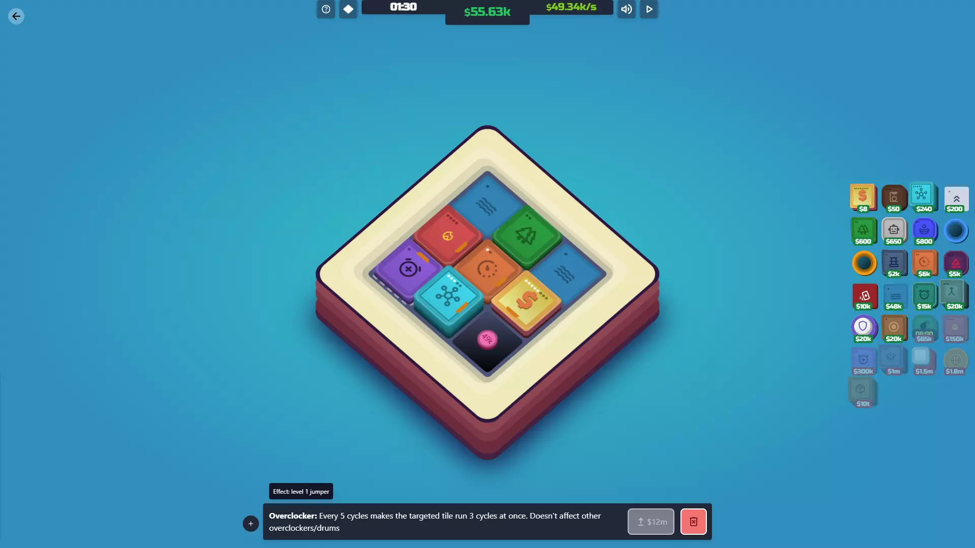 超频器 解锁条件:放置你的第一个加速地砖。 功能:与鼓类似,超频器可以提高地砖的循环速率。但超频器是定向地砖,这意味着与鼓不同,它们一次只能影响一个地砖。 超频器能在更短时间内加快你的游戏进度。你可以将它们指向任何基于循环运行的地砖,看着它们快速运转!升级成本较高,但能使其效果提升两倍多,因此绝对值得。 遗憾的是,没有任何方法能与超频器产生协同效应来增强它。它能与许多其他地砖产生协同作用,但自身无法被任何方式强化。 成本 等级 效果 升级成本 等级1:每5个循环使目标地砖一次性运行3个循环。不影响其他超频器/鼓 15万美元 等级2 每5个周期使目标格子一次性运行10个周期。不影响其他超频器/鼓 1200万美元 协同效应 周期格子:任何基于周期运行的格子都能从超频器中获益。像升级器、赞助商和加速器这样的格子都能从超频器中获益。 中央:将超频器指向中央能大幅提升你的产量。通过升级,超频器能使中央的产量翻倍。它也能与必须斜向放置的主教形成良好协同。 工厂:反协同。超频器最好用于中央而非工厂,因为额外的周期不会增加工厂的产量数值,而中央的产量数值正是以此为基础进行乘法计算的。使用【公园】效果更佳。 【加速器/投资者】:这或许是使用【超频器】最有效的方式,这些板块能帮助提升你的【工厂/中心】产量,因此提高它们的激活频率无疑是有帮助的。 【篝火】:增加【篝火】提升产量的次数非常好。但要注意,这也会加快【篝火】的升级衰减速度,所以你必须密切关注它。 【鼓】:存在反协同效应。【超频器】对【鼓】无效,【鼓】对【超频器】也无效。