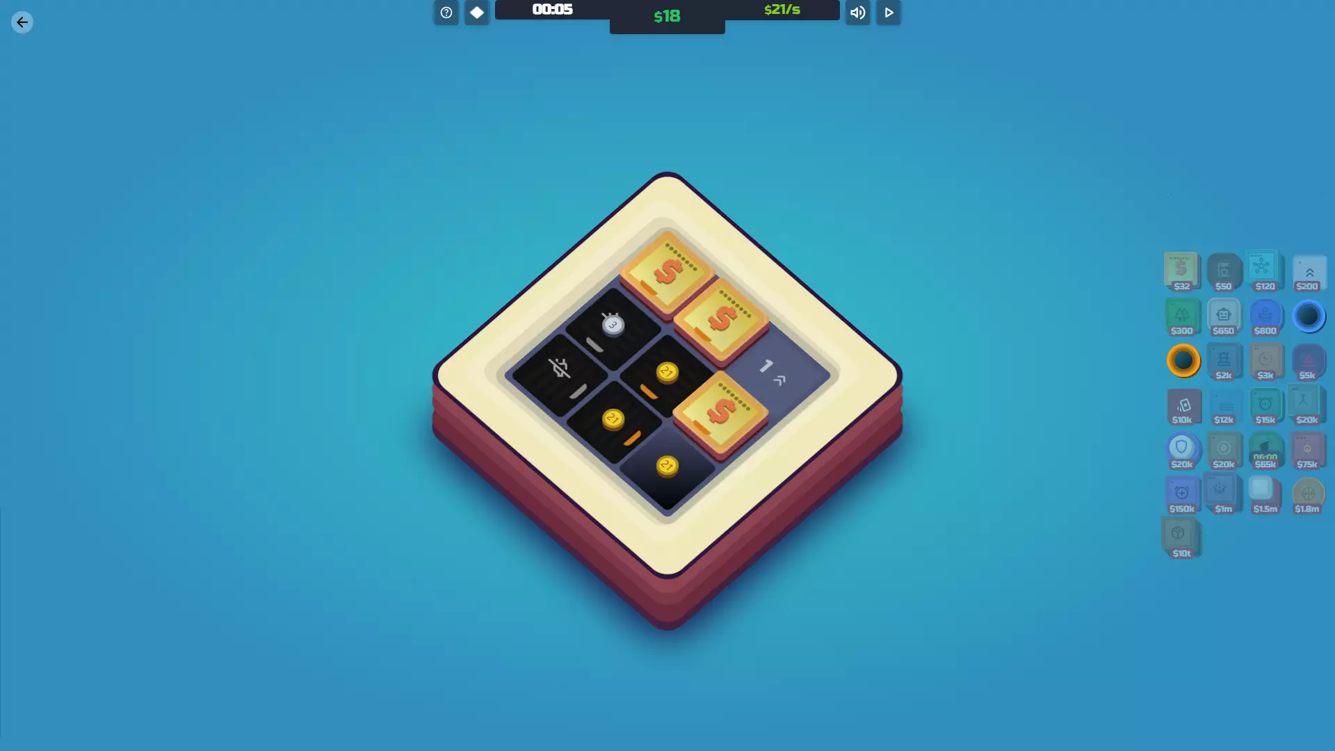工厂已解锁 每张地图开始时你会免费获得一个。 功能 这是你的主要硬币生成器。工厂初始每个周期生产1美元,可通过升级大幅提升产量。 点击并拖动可设置硬币产出方向。 工厂会与任何带有生产加成的物品产生互动。 成本 等级 效果 升级成本 1级 每个周期生产1美元 免费/8美元 2级 基础产量提升至2美元 25美元 3级 基础产量提升至3美元 75美元 4级 基础产量提升至3美元。所有产量乘以2 400美元 5级 基础产量提升至5美元。所有产量乘以3 1美元5000美元 等级6 基础产量提升至10美元。所有产量乘以5 20000美元 等级7 基础产量提升至20美元。所有产量乘以10 400000美元 等级8 基础产量提升至50美元。所有产量乘以100 2亿美元 等级9 基础产量提升至100美元。所有产量乘以200 200亿美元 协同中心:产出与其接触的所有工厂的总和。一级仅正交方向接触有效,二级增加对角线接触,最终级无需接触即可生效! 咖啡:接触时增加工厂产量。在游戏初期非常有用。 公园:接触时按百分比提升工厂产量。赞助商:降低工厂升级成本。有助于达到重要的8级。 主教:斜向放置时会使工厂产量翻倍,但正交放置时会使产量除以1.5。你应该尽量在工厂上放置尽可能多的主教。 加速器:面向工厂时为其产量增加1美元。可以升级以提高生效频率,增加的美元金额也可以升级。这种协同效应是你快速赢得游戏的关键。 鼓/超频器:使与其接触/面向的工厂运行更频繁。 篝火:永久提高工厂的产量。这是一种不错的工厂升级方式,但最好留着用于升级加速器。 投资者:提高地图上所有工厂的产量。非常强大。前三级按固定数值增加,最后一级则改为增加1%。这是你达到10吨以放置箱子的方法。多个投资者会同时提升工厂产量,因此拥有多个投资者会让你获得更多收益。