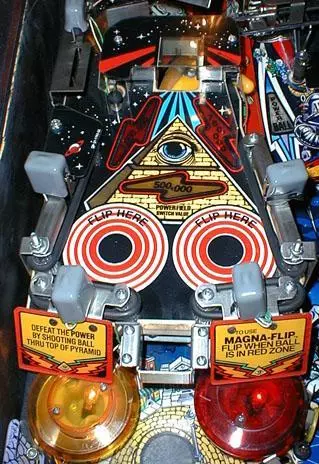 你正在穿越另一个维度;一个不仅有视觉和声音,还有思想的维度。这是一段通往奇妙之地的旅程,其边界就是想象力的边界。你的下一站:阴阳魔界。 希望这没有侵犯版权。 本指南将教你如何游玩一款Bally经典之作,也是有史以来最棒的弹珠台:阴阳魔界。内容将涵盖多球模式、能量球、能量球狂热、能量场、门板模式以及巫师模式。别担心;这不是食谱,所以不用打破你的眼镜。 我可能很快就要被起诉了。 如果我过多地偏离到实际弹珠台本身,请原谅我。我参加过几次锦标赛,并且已经拥有两台漂亮的弹珠台了。如果你注意到了这个问题,我深表歉意,但这应该不会对《弹珠台街机》中TZ的游戏玩法造成太大影响。去玩一局真正的游戏吧。玩弹珠台! 另外,我是左撇子,所以可能会混淆左右,但这应该没什么大不了的。哦,一切都弄反了! 太好了。现在Stern要起诉我了。 TZ基础知识 游戏场 《阴阳魔界》包含四个 flipper(弹杆):两个在下层,一个在中场右侧,还有一个小型的在顶层右侧。在游戏的右上角,你会注意到一个名为能量场的小型游戏场。它的底部左右两侧各有一个磁铁,顶部和底部各有一个孔洞。游戏内设有多种道具,例如能显示模式时间的功能性时钟、钢琴,以及可分发弹珠的功能性口香糖机。默认情况下,口香糖机内有三枚弹珠,其中包括能量球(更多信息见【能量球】)。游戏场地上有两条轨道、两个坡道、一组三个喷气保险杠、两个弹弓、双左内道、双发射道,以及多个磁铁。游戏共可容纳5枚普通弹珠和1枚能量球。