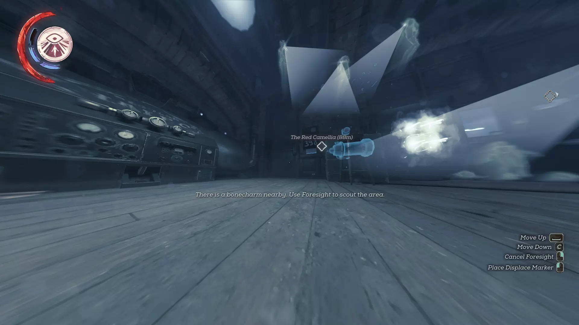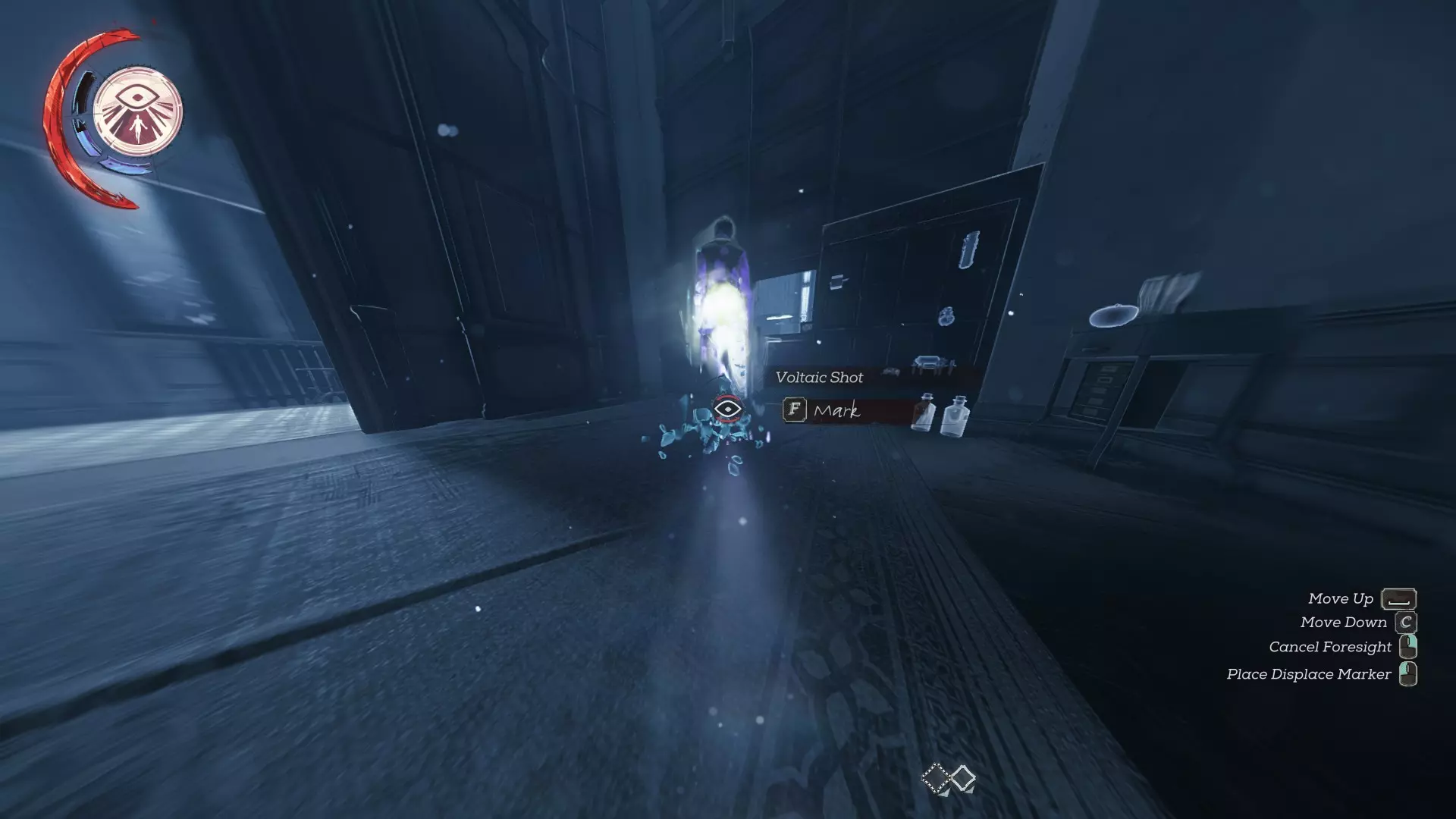 在柜台视线范围内放置一个【位移】标记,比莉走到商店前方时就能与之互换位置。进入阳台下方的楼梯间。返回商店的途中不要使用【位移】,否则会丢失刚刚放置的标记。