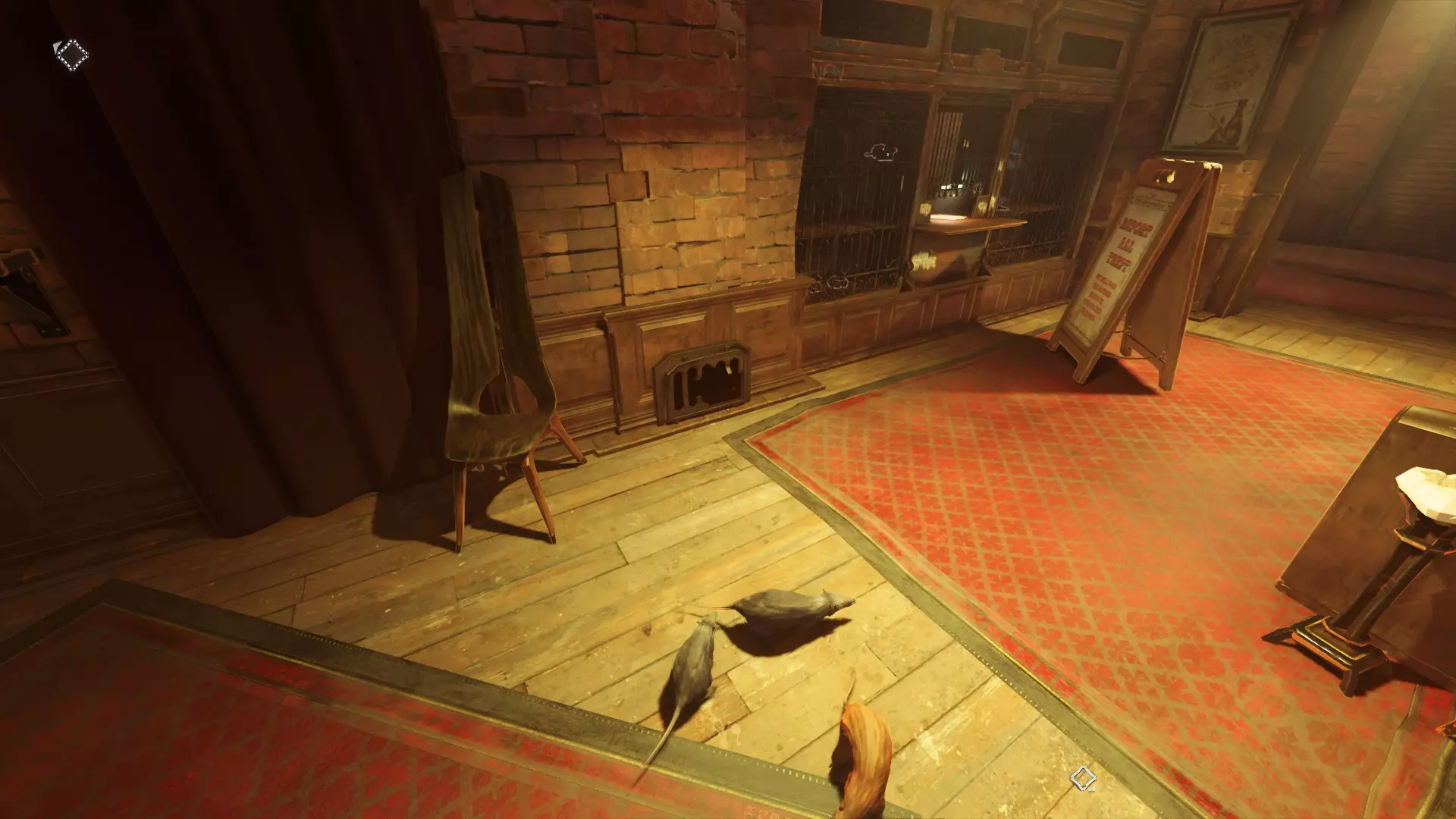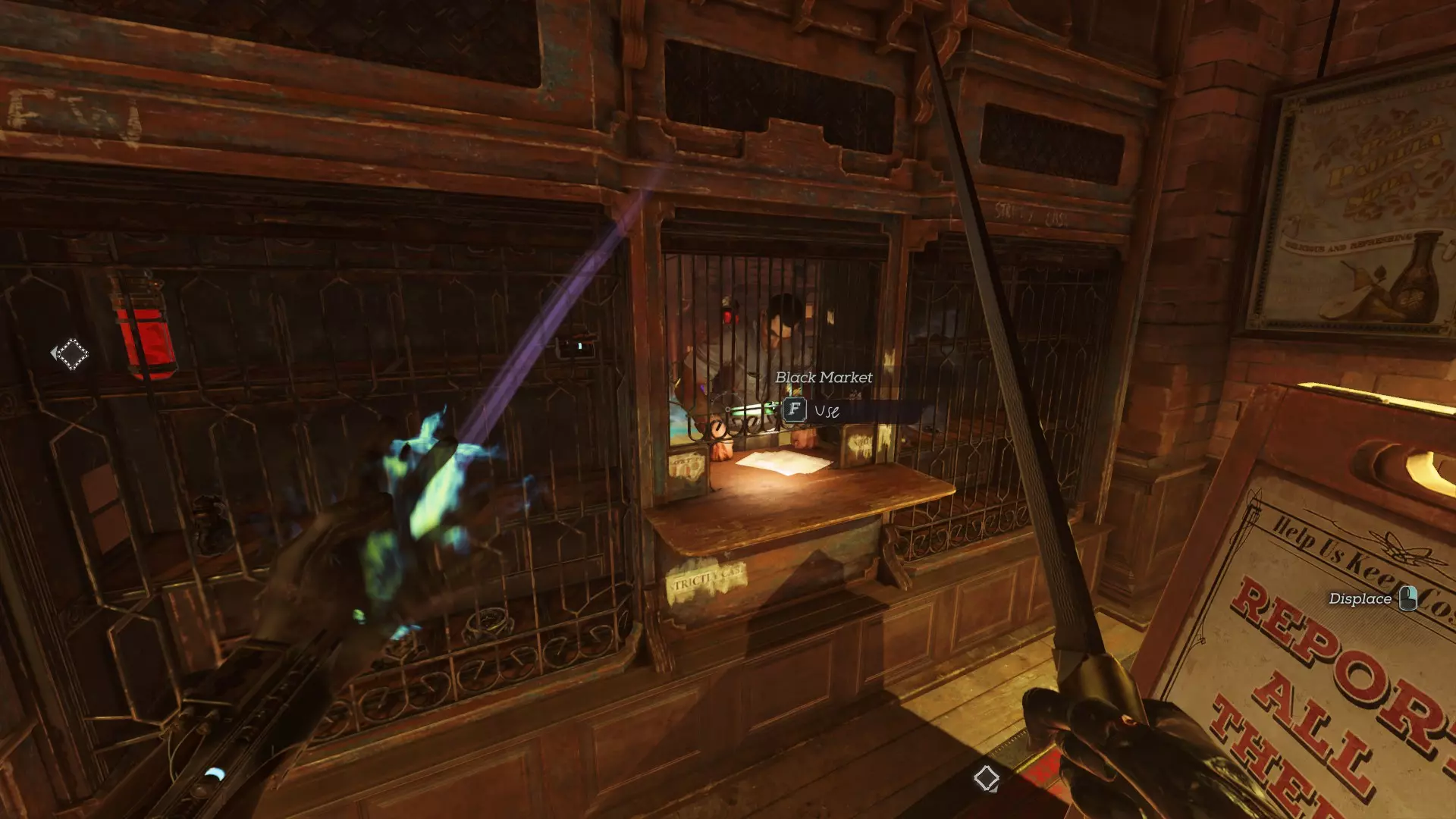 要抢劫这个黑市,需通过温室对面的阳台进入其后方房间。在房间内,你必须使用【预见】能力穿过老鼠洞,到达商店柜台后方。