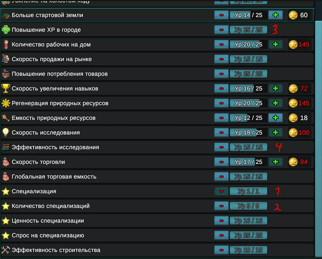 基础资源(木材、石头、水)的自动化:手动点击效率低下。 不要忘记建筑物! 虽然初期除了用于加速科技的学校和供人们居住的小屋外,你可能不需要其他建筑,但未来没有它们,你将无法进行交易,也无法正常生产任何东西。 牢记区域负面效果!你可以记录下哪些地区的何种资源充足,哪些地区资源短缺,以便日后在各地区之间开展进出口贸易。对了,在后期可以将地区的负面效果降至0,不过要保密哦。不要忽视低于100%的商品销售!理想情况下应该是这样的!