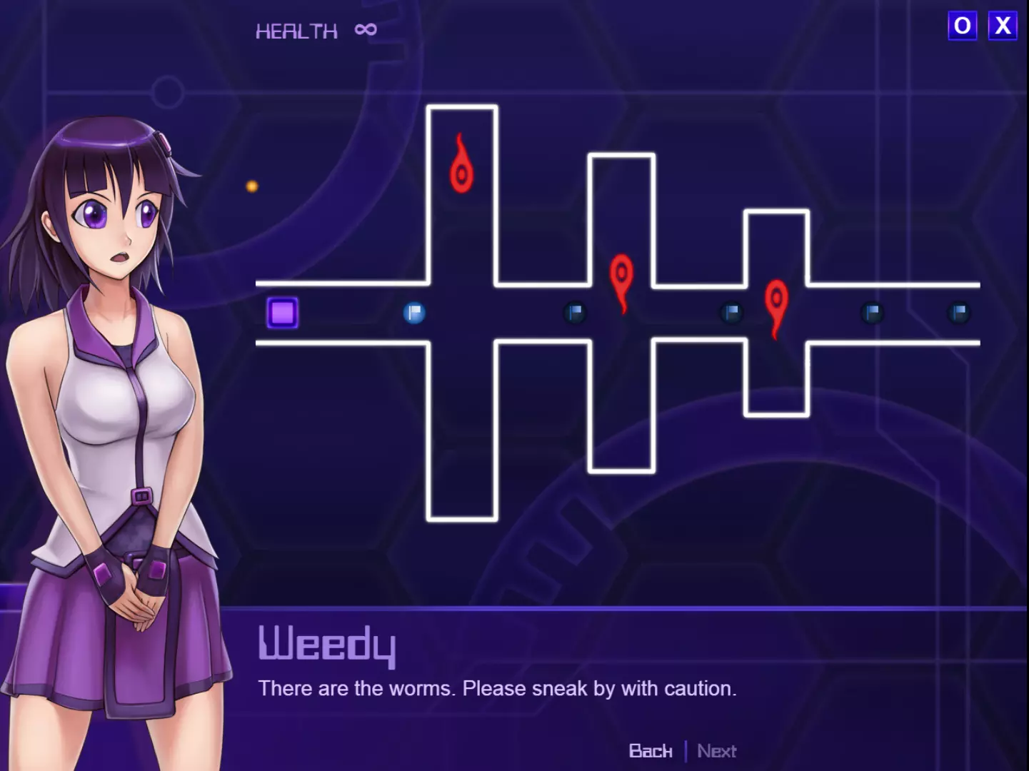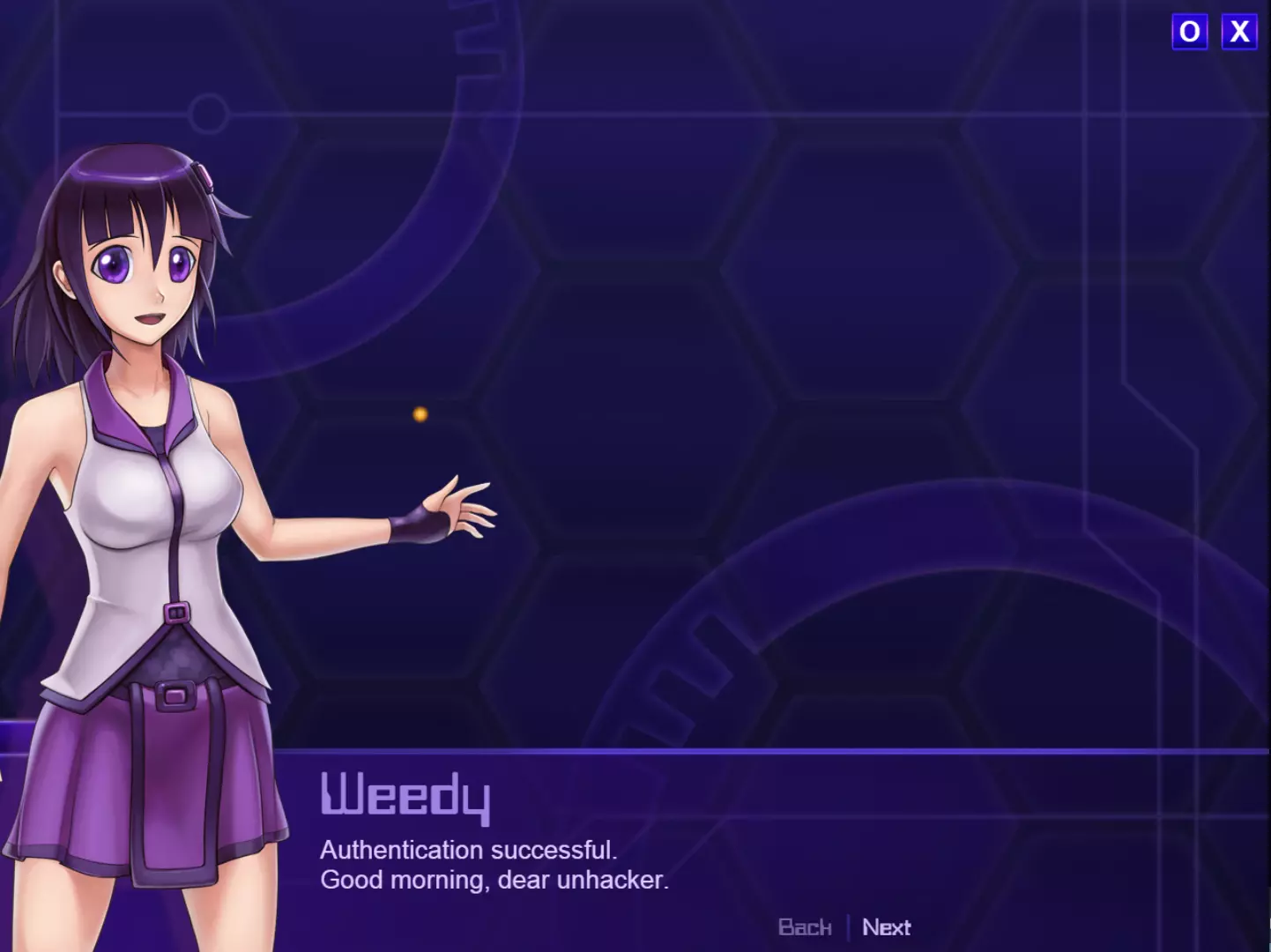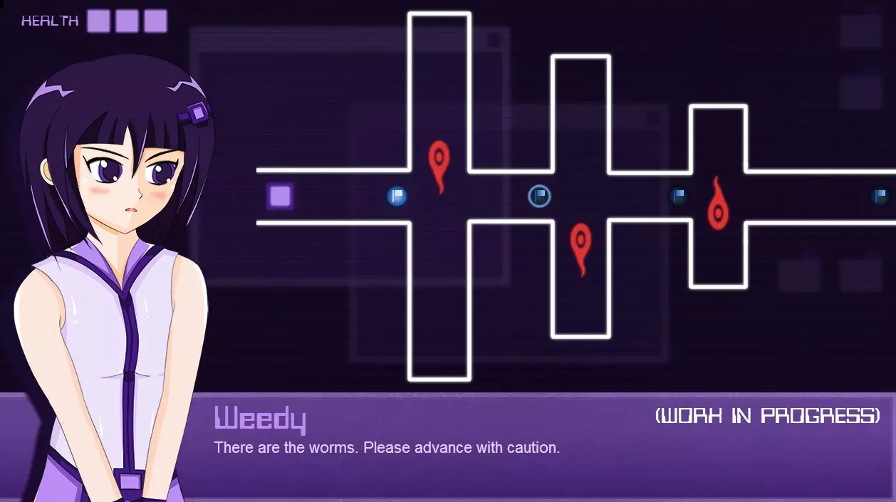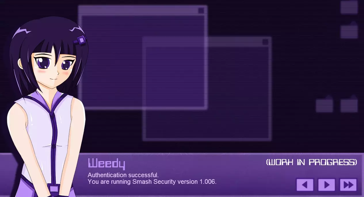 Weedy:“现在正在进行源头定位。如果能侵入那里,应该就能取得战果。” 译者解说:开发中的《Unhack》。Weedy和蠕虫等设定被保留到了正式版中,同时还能看出存在类似《超执刀 卡多裘斯》那样通过指针直接驱除蠕虫的要素。啊,这感觉…… ※6:在DS和Wii平台上发售的外科手术游戏。总之只要狂喷治疗凝胶就能救患者。虽然难度高但却是名作。(直接营销) 系统 结构[unhack.wikia.com] 《Unhack》计划推出共7个章节。 每个章节都包含导入部分,之后会接续动作部分。玩家在完成动作部分后,可在结束章节前阅读尾声。 即使在动作部分进行中,游戏也会同步显示文字内容。《Unhack》首先是一款文字冒险游戏,同时也是一款动作游戏。 动作部分的目标可能因章节而异。 玩家的化身在每回合[※7]拥有3条生命。 化身没有初始武装,但随着游戏推进,可以利用场景中的装备对敌人发起攻击。【※8】 ※7:或许,原本的构想是即便是同一章节,较长的内容也会进行分割。 ※8:指的或许是正篇中登场的爆破装置。 Weedy Weedy是粉碎安全公司的官方AI,通过软件广告在普通民众中也广为人知。 她会协助《Unhack》的5K蠕虫清除工作,“清理”客户的机器。 Unhacker的工作时间为9点到18点,周末休息,但Weedy没有休息日。 周末的她会开发用于支援Unhacker的新装备和功能。作为粉碎安全的“门面担当”,她言行谨慎、工作踏实,因此赢得了全球客户的支持。