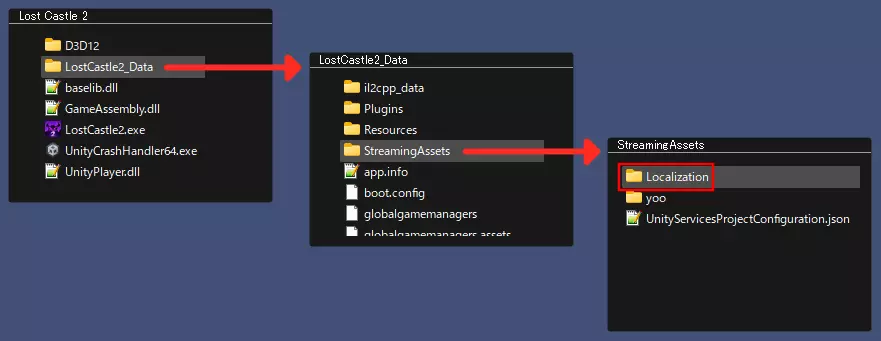 2:打开Localization文件夹。该文件夹位于“LostCastle2_Data”→“StreamingAssets”路径下。