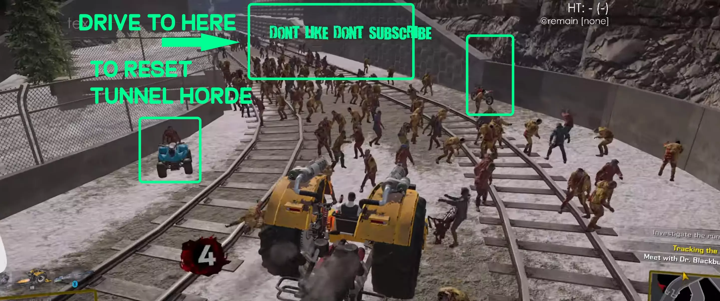 - 开车到尽头(我的【踏行者】无法继续前进的地方) - 掉头,开到黄色火车头前的地下通道,再次掉头并重复此操作。 这就是视频40分10秒处展示的内容。不过,如果你只想要击杀僵尸而不在意PP,你可以刷“隧道尸潮”,掉头开车穿过地下通道,然后返回继续刷隧道尸潮。这比一路开到尽头再返回更高效。 - 黄色火车头前的地下通道,是为了让隧道尸潮刷新而需要行驶到的最远距离。你无需开到黄色火车头处或越过它。